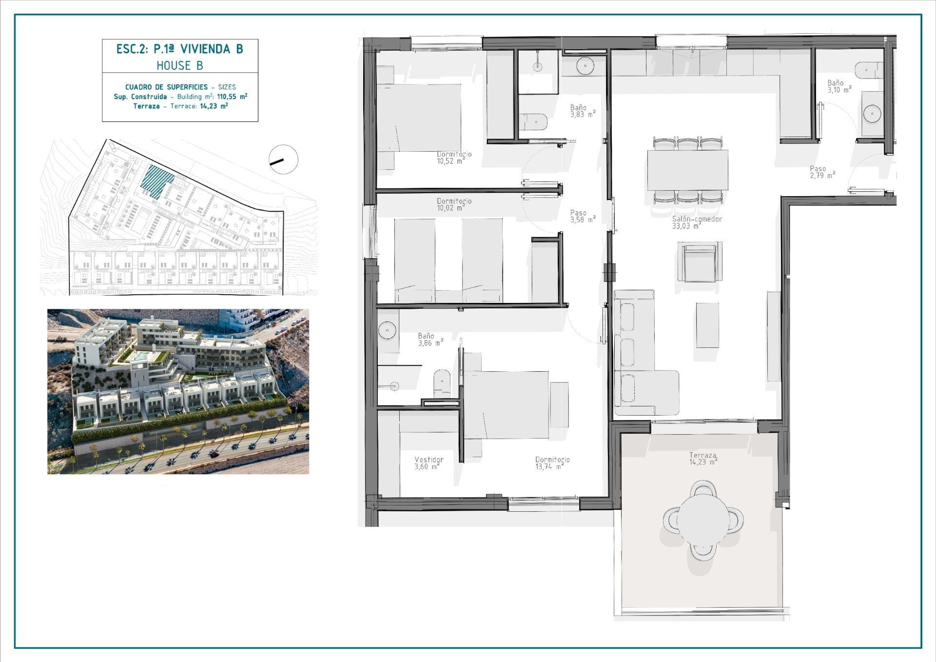 NEW BUILD RESIDENTIAL COMPLEX IN AGUILASNew Build exclusive residential complex of apartments and villas in Aguilas.New Build complex consist of 36 apartments with 3 and 2 bedrooms distributed in 4 modern blocks, equipped with 2 communal swimming pools and community garage with parking space and storage room for each property; and 10 elegant villas of 4 bedrooms and 3 bathrooms, each one with its own private pool. This residential complex has been designed with excellence in mind, offering spacious terraces on the ground and first floors and solariums on the upper floors, where the view of the horizon becomes a canvas of experiences.The houses have fully equipped kitchens and bathrooms and pre-installation for ducted air conditioning.Complex located 800 metres from the sea, next to a Shopping Centre.Aguilas located in exceptional area on Costa Cálida at only 50 minutes from the new Murcia or Almeria airport and 1h30 from Alicante airport.Aguilas it is a small city with many amenities, a long beach to walk and relax in the sun. Is a perfect enclave for diving, water sports, hiking and golf.It has 28 kilometers of coastline in which there are 35 beaches with different types of sand thickness located in different landscapes, from coves and virgin beaches in natural settings to the urban beaches of the town of Aguilas.Its warm desert climate is present all year round with an annual average of 22º with mild temperatures in winter and very hot in summer.