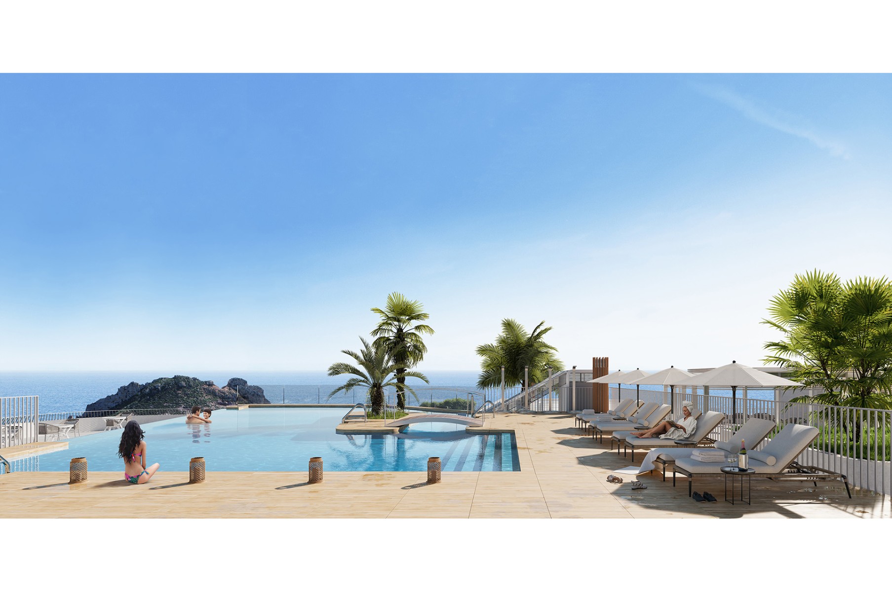 Thanks to the use of high-quality materials and a design that pays homage to the contours of the mountains, the apartments here merge effortlessly with the lush vegetation, creating a symphony of elegance and nature. Stepping into this sanctuary, you are transported into an atmosphere of tranquillity, where the gentle melodies of the sea echo in the background, enveloping you in an oasis of calm.