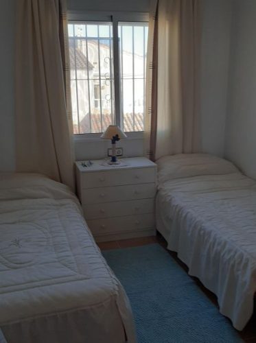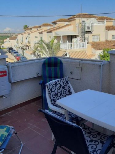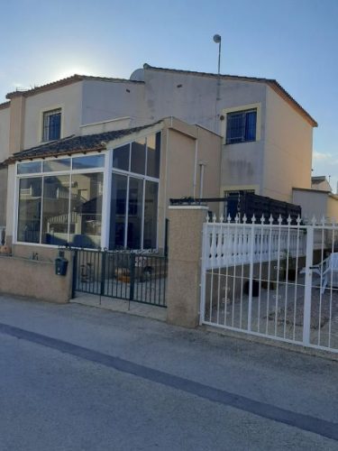 SPACIOUS 3 BEDROOM QUAD LOCATED ON MONTEBELLO, ALGORFA, ALICANTE. The property consists of a large glazed in porch leading into a lounge with separate dining area and kitchen off. There is a covered utility at the rear of the property. The ground floor also has a double bedroom with bathroom next door. Stairs lead up to a landing with 2 further double bedrooms and second bathroom. There is also access from the landing to a good sized terrace with views over the surrounding countryside. The property has air con throughout and the outside plot has a number of paved patio areas including a driveway for parking. Build size: 95m2 Plot size: 140m2 SUMA: €300 Community fee: €300