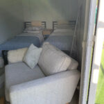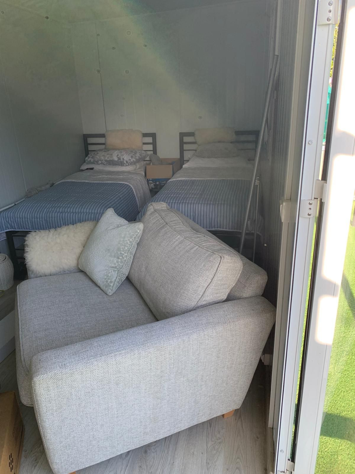 Open-plan studio living/bedroom with two single beds