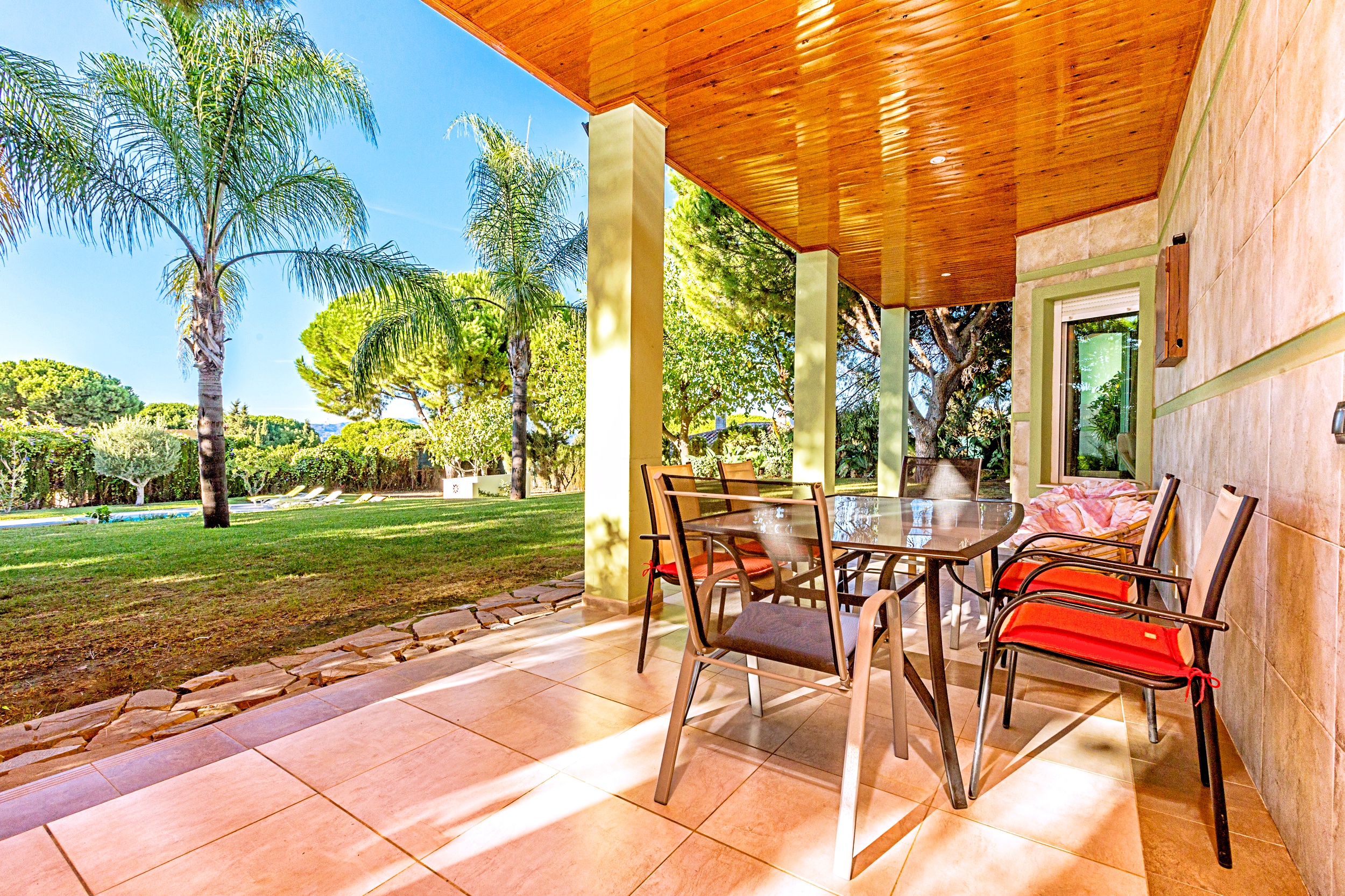 - Porch roof covered in varnished wood.