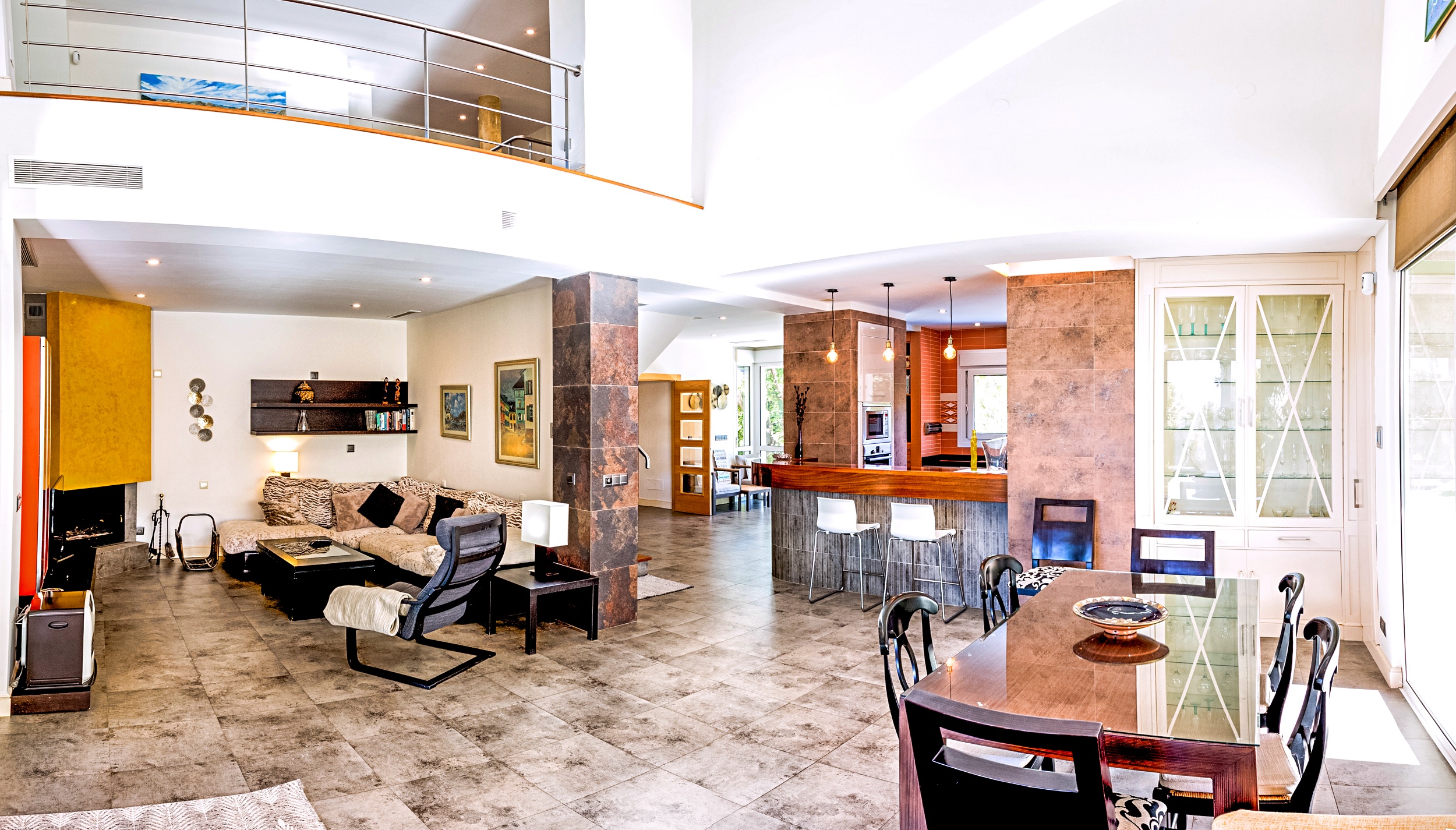 The house has a modern design with double-height ceilings and large windows: