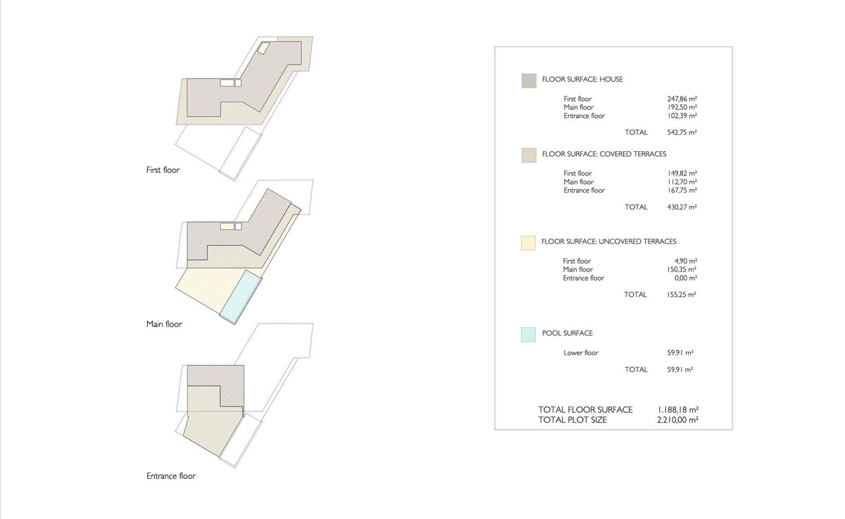 This construction can either be joined to the previous house (forming, in this case, a ground floor of 210 m2 open plan, plus a first floor of 250 m2, plus a third of more than 200 m2) or finish an independent house.