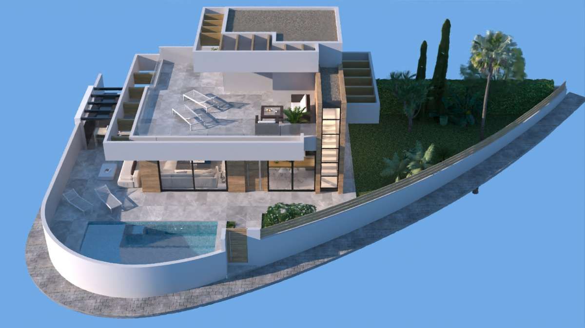 On the ground floor there is a large living room, dining room and open kitchen, two bedrooms and a family bathroom. On the first floor, a huge bedroom and bathroom suite opens onto the terrace of almost 50 m2.