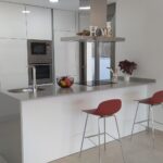 in the kitchen we find furniture finished in white and quartz worktop in a colour matching the floor of the house.