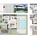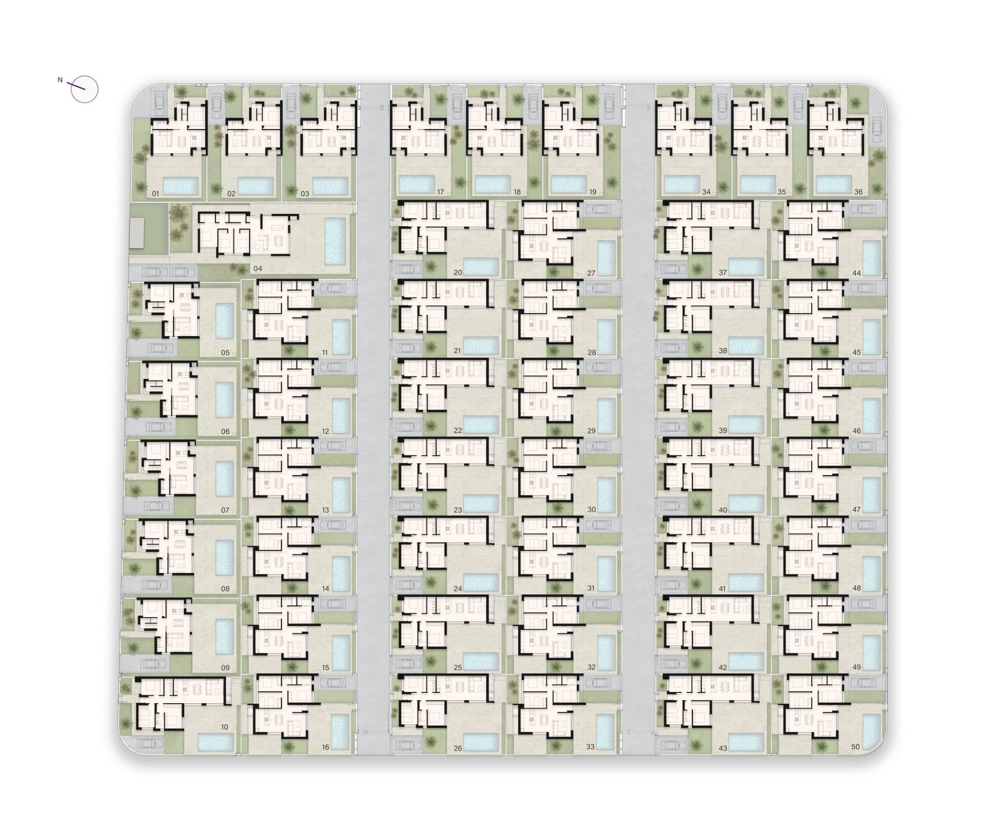 Villas: independent properties with three bedrooms and three bathrooms, available in one- or two-story layouts. Each villa includes a private pool, a solarium, and parking within the plot. Optional basements are also available.