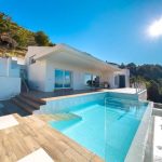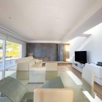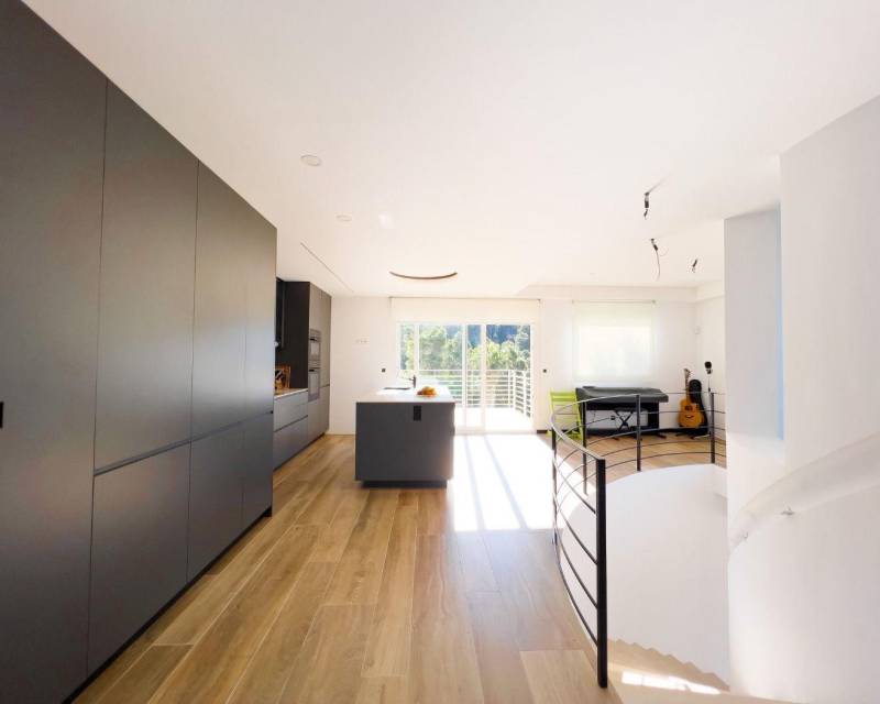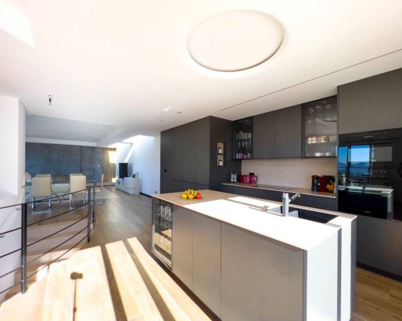 The top floor has a large open-plan living space with a Porcelanosa kitchen, access to the main terrace with infinity pool, BBQ area, and outdoor bathroom. Equipped with underfloor heating, air conditioning in every room, and smart home control.