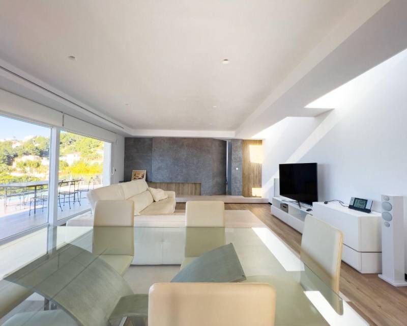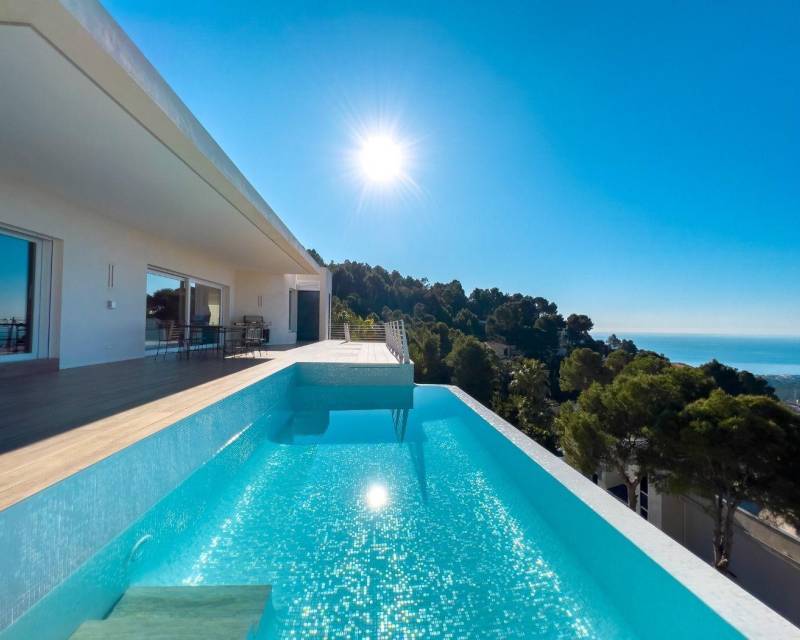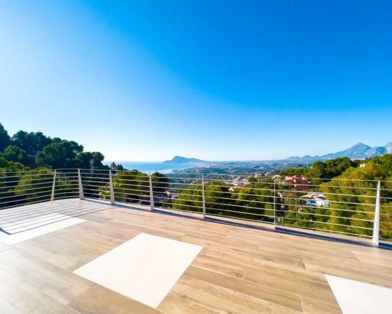 Modern 4-story villa for sale in a quiet green area of Altea, offering panoramic sea and mountain views. Built on a plot of 814 m², it includes multiple terraces, a pool, and spacious outdoor areas.