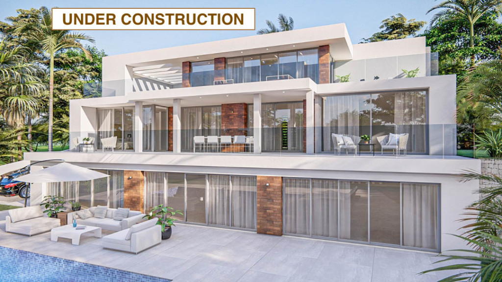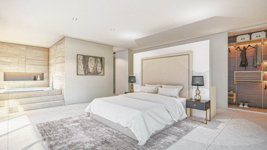 The villa is spread over 3 levels, has 4 bedrooms and 4 bathrooms. The master bedroom suite with sea view (36.40 sq_m) and walk-in wardrobe (15.70 sq_m) are on the top floor with an ensuite bathroom (16.15 sq_m), a covered terrace (57.50 sq_m), an open terrace (57.20 sq_m) and a stairwell. On the ground floor, there is a living area with open kitchen (94.75 sq_m), a laundry room, guest toilet, 2 bedrooms with a shared bathroom and an ensuite bedroom with sea views and an en suite bathroom and a stairwell. On the lower floor there is an open kitchen with BBQ, a living area, a TV room, a technical room and a storage room. On the same floor, there is a large terrace and a swimming pool. This villa is the sum total of space, lots of luxury and breathtaking views! Completion August 2024 (subject to change).