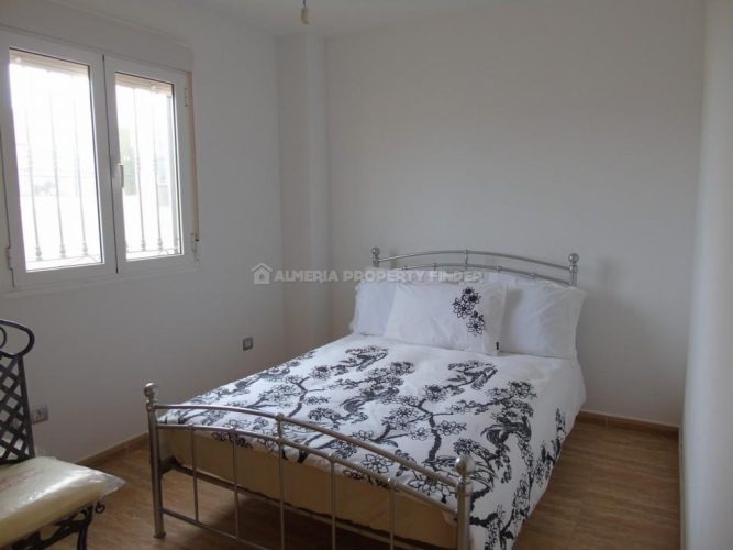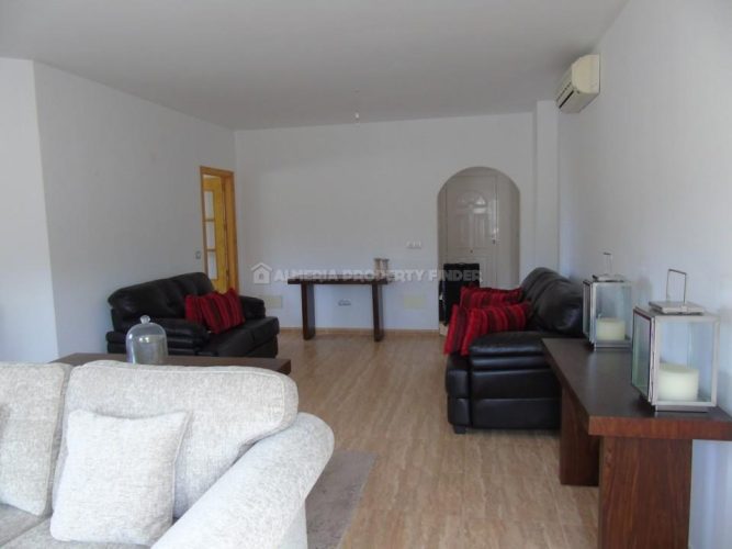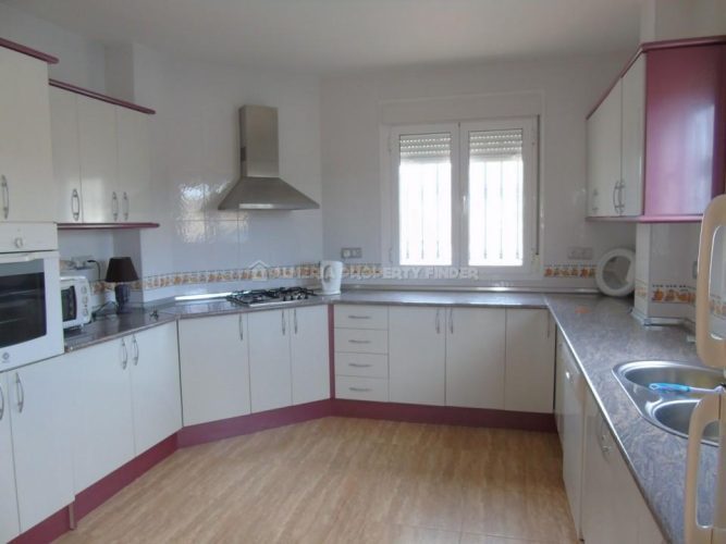 The villa is a spacious light and airy 104m² and comprises of an entrance door leading into a hallway with an archway leading into the large and spacious lounge/dining room with air conditioning. A part glazed door to the left opens into the spacious and bright fully fitted kitchen comprising a good range of wall and floor units, gas hob with extractor above, electric oven, dishwasher and washing machine. From here a door opens into the utility room with gas boiler, sink and room for white goods and there is a door leading outside to the side of the property.