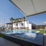 The villa is on a plot of 1241m2 of which 602m2 is garden. The stunning pool is 75m3 and has an independent Jacuzzi with integrated massage bed and outdoor shower. There is a dugout chillout area below the level of the pool with glass screen. This leads to the 90m2 above pool level covered chillout area which has a full summer kitchen/bar and lounge dining area. There is also a full shower room which also has W/C and wash basin.