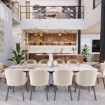 On the ground floor, the main entrance opens onto the left wing, which houses an open-plan living area comprising a lounge and dining room, as well as a double-height kitchen. The lounge features a remote-controlled suspended fireplace that allows the flames to be directed. A door from the kitchen provides access to the service kitchen, which has a separate staff entrance.