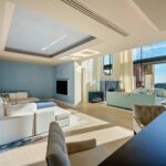 The villa offers 715 m² of refined interior living space complemented by 453 m² of terraces designed for seamless indoor-outdoor living. The layout is thoughtfully arranged across three levels. The first floor is dedicated to the luxurious master suite, complete with a dressing room and private library, alongside an additional guest ensuite. On the ground floor, elegant formal and informal living areas flow effortlessly into the dining space and fully equipped kitchen, with large openings leading to expansive terraces and a heated sea-salt infinity pool that frames the surrounding landscape.