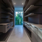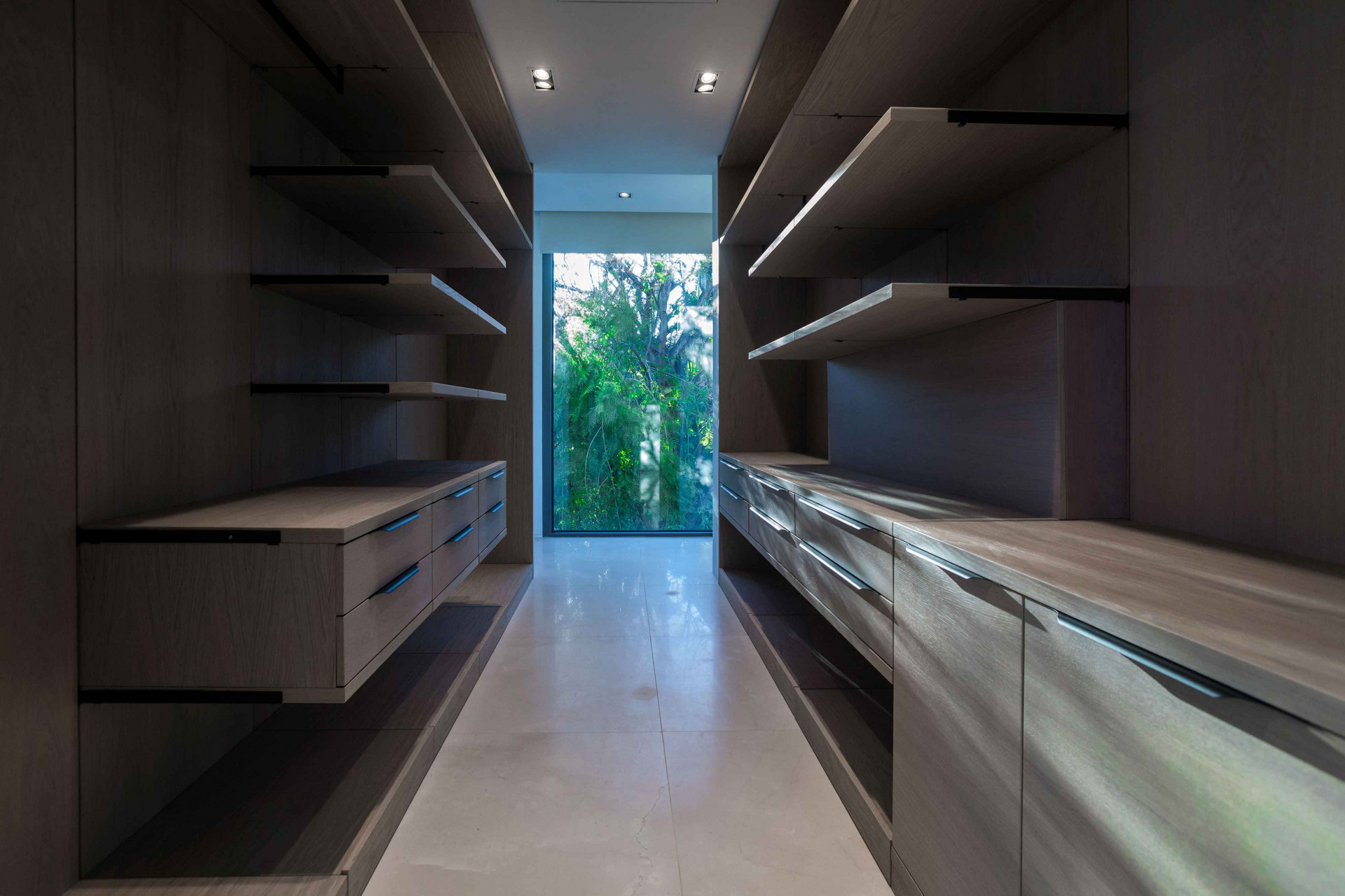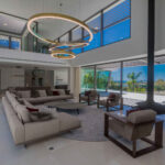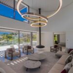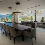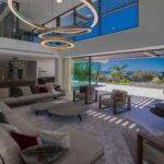 The lower floor is dedicated to leisure and relaxation, featuring a playroom, bar, TV room, cinema room, gym, and a spa with a sauna, steam room, and an 8-person jacuzzi. The rooms surround a tranquil zen interior patio, opening up to the garden with an outdoor TV and an infinity pool, creating a haven for entertainment.