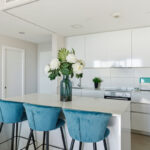Spacious open-plan living, dining and kitchen area, flooded with natural light and double height ceiling;