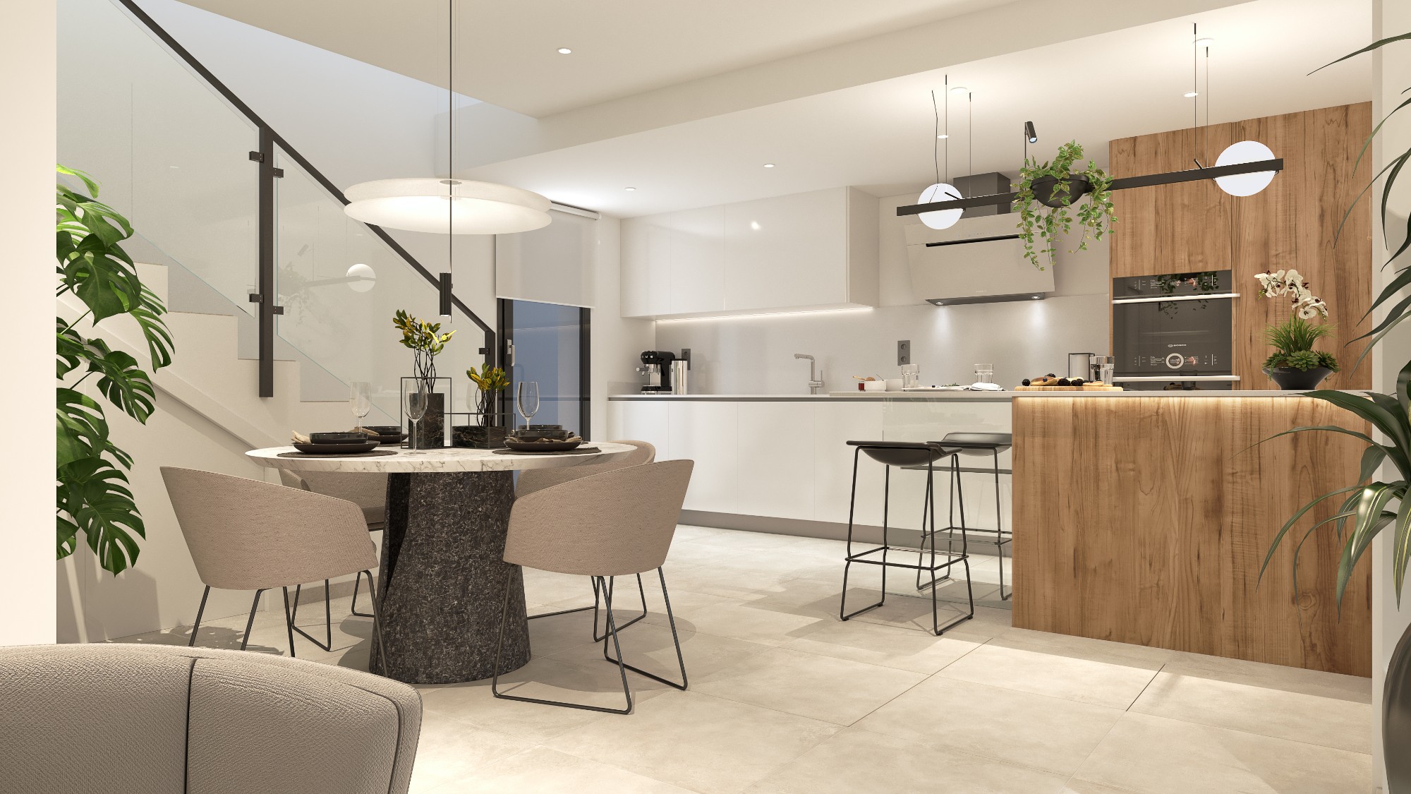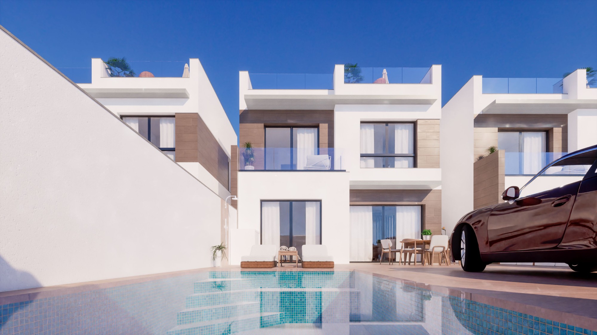 These terraced villas, with 3 bedrooms and 3 bathrooms, with a solarium of 47.50 m2, a swimming pool of 18 m2 (3x6m) and a closed parking space are expected to be delivered in March 2025. Located in the bustling Benijofar, known for its cozy restaurants and bars, this project forms a lively living environment. The total development includes 20 semi-detached villas, of which the first phase (4 villas) has already been sold and the 2nd phase is currently under construction. These villas will be delivered with fully furnished kitchens with the following kitchen appliances included: Fridge-freezer, extractor hood, induction hob, dishwasher, built-in microwave and oven. The bathrooms will have underfloor heating and the house will also have air conditioning as standard. In addition, the house also has electric shutters and there will already be a pre-installation on the solarium for the connection of a jacuzzi.
