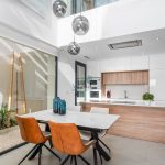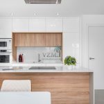 High and low cabinets in the kitchen, all white lacquered with wooden details.
