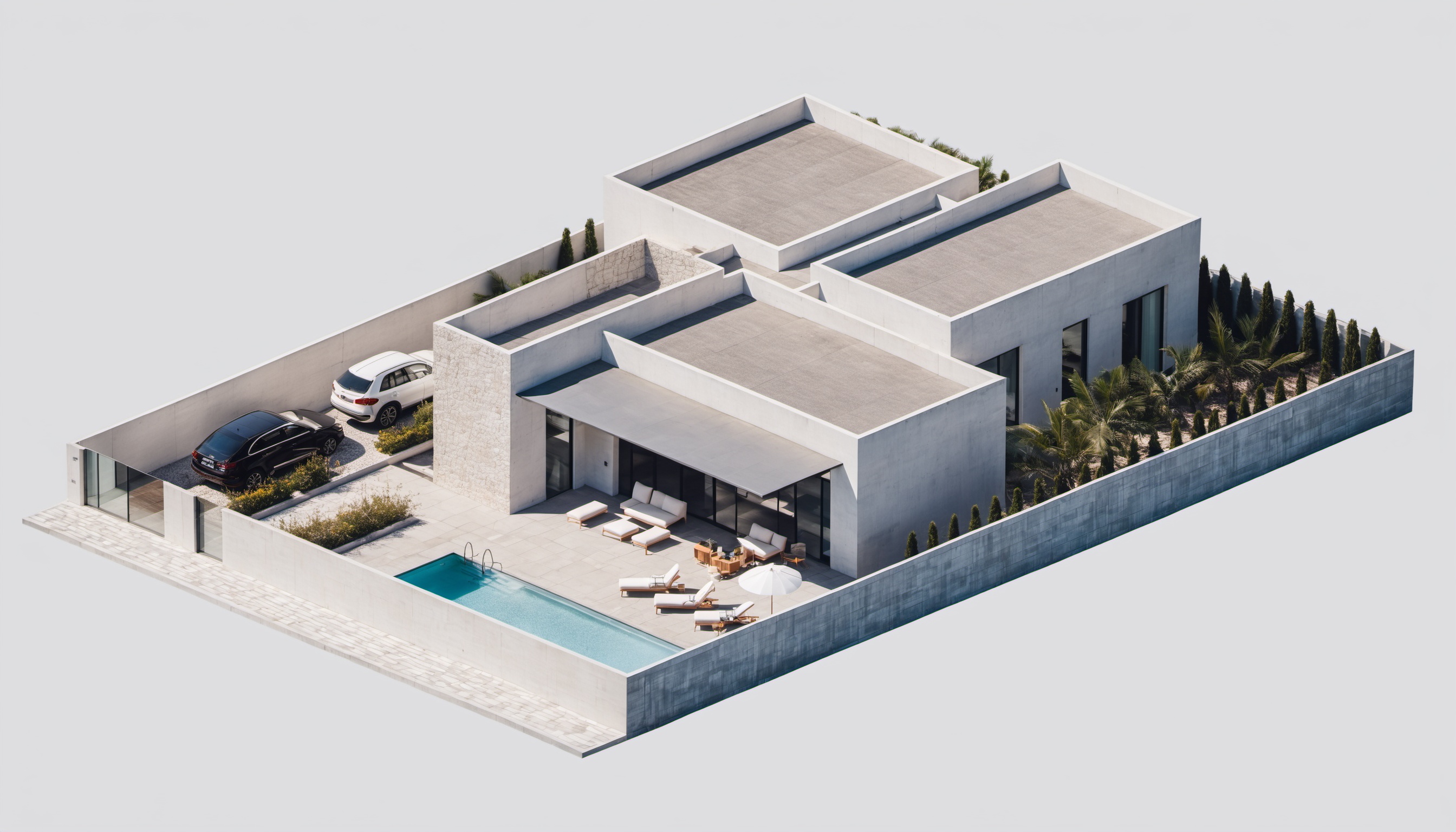 The exterior design of the villas in Benijófar combines elegance and functionality. Each villa is set on a large plot of 535 m², offering a spacious and private setting. The Mediterranean style garden is carefully designed to offer a green and relaxing space. The private swimming pool is perfect for enjoying the sunny Costa Blanca weather, while the 40 m² terrace provides an ideal space for al fresco dining and relaxing. The private parking area ensures convenience and security for residents. The modern architecture and high quality finishes blend perfectly with the surroundings, creating a harmonious and aesthetically appealing space.