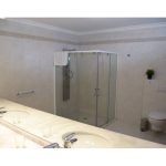 Spacious bathroom with shower.