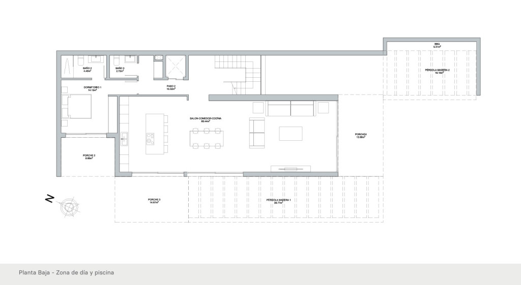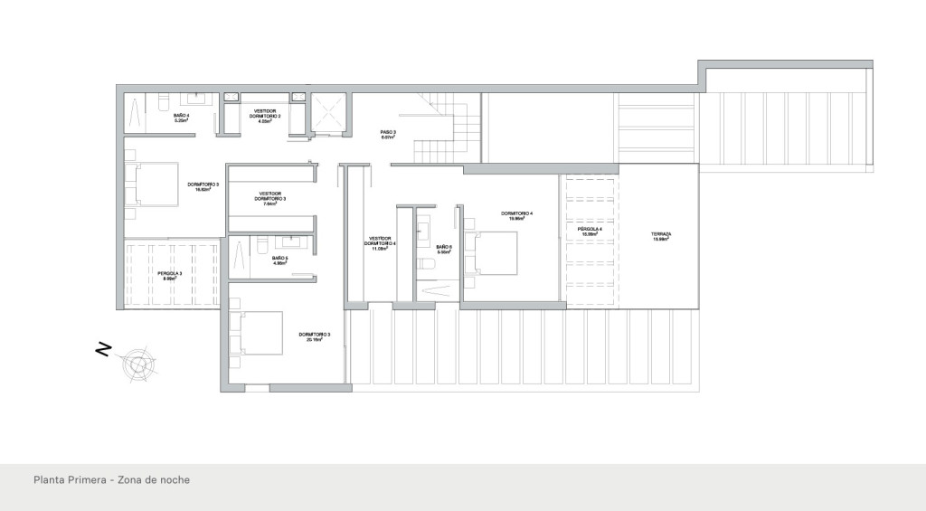 The villa has a total built area of 459 m2 distributed over two floors + a basement with a double garage. The ground floor comprises a spacious living-dining room with a modern, open-plan kitchen, a bedroom with an en suite bathroom and private terrace and a guest toilet. On the upper floor there are three more luxurious bedrooms, each with an en suite bathroom and dressing room. One bedroom has access to a private terrace through sliding windows and the other two bedrooms share a very spacious terrace. The basement comprises a garage with parking space for two cars, an entrance hall and a guest toilet. Outside, there is a swimming pool surrounded by several terraces both covered and uncovered. The villa has a spacious driveway with access to the garage. A pre-installation for pool heating and a pre-installation for an alarm system will be installed. The air conditioning system being installed is the AEROTHERMIA system for heating and cooling and underfloor heating throughout the house with AIRZONE system.
