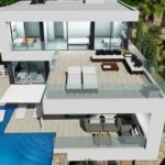 New build villa for sale with sea views in Calpe, located in a quiet residential area 2 km from Puerto Blanco and the beach. On the ground floor there is a spacious living room with an open kitchen that gives access to the terrace, the infinity pool and the BBQ area. There is also a double bedroom with an en-suite and a dressing room and a guest toilet. On the first floor there are 3 double bedrooms, all with dressing room, en-suite and terrace. In the basement, which is connected by elevator to the rest of the house, there is a large double garage, an entrance hall, a multifunctional room of 60m2, a storage room, a utility room and a bathroom. The villa is built with only high quality materials, more information available on request.