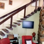 A sweeping Floating stairway leads down to an open plan rustic style Lounge / Dining room This has feature stone walls and chimney in the double height vaulted ceiling room.