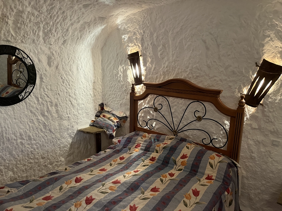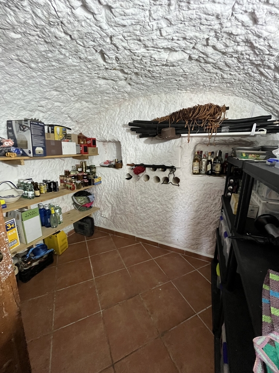 The cave has 3 bedrooms, kitchen, large dinning room with log burner, living room, bathroom with seperate toilet and a large cave garage. There is a large front patio and also a plot of land in front of the cave with three terraces.