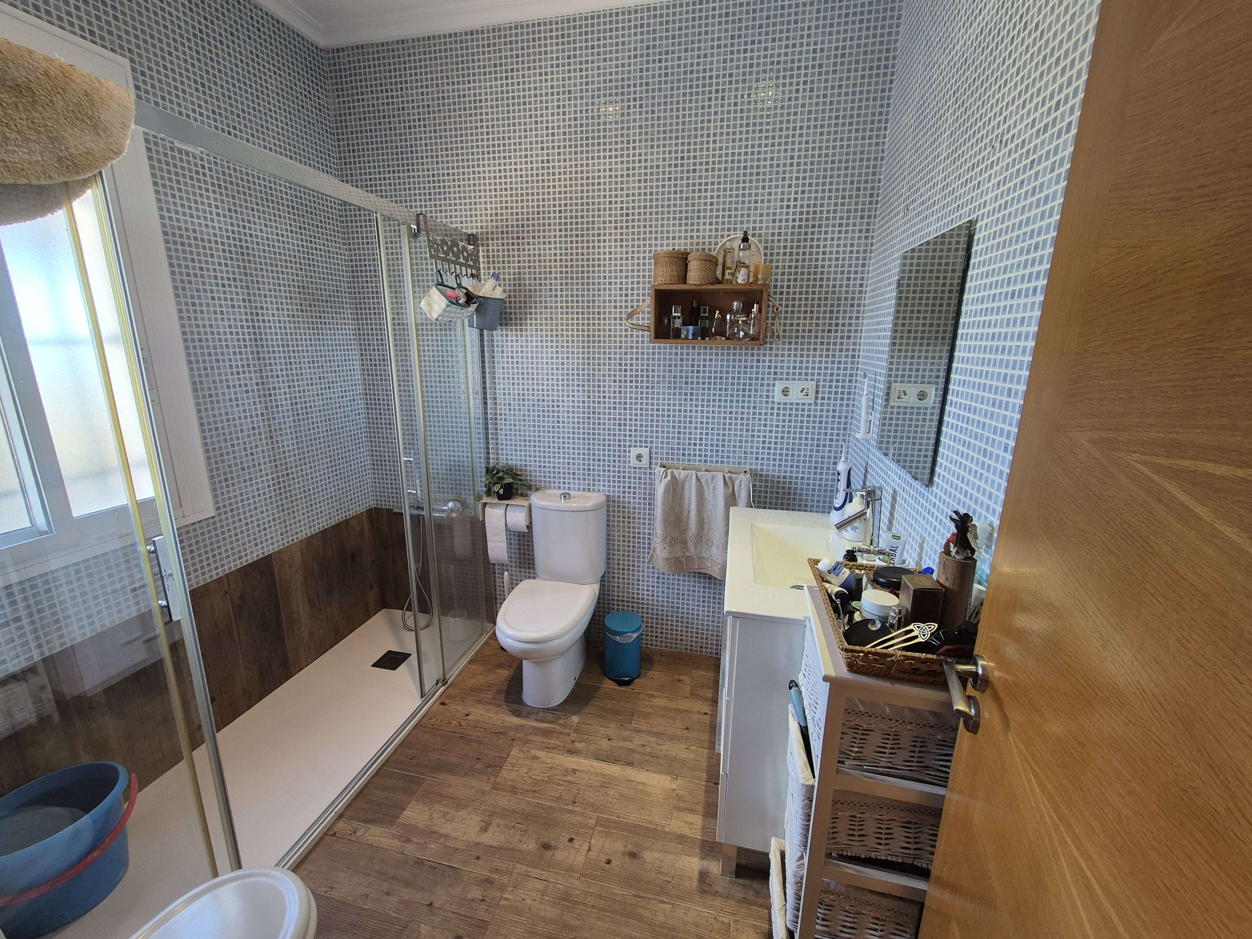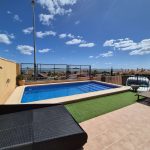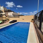 The whole front garden is fully tiled with steps leading up to the 7m x 3.5m swimming pool with a shower on a spacious terrace in front of the pool which is ideal for relaxation, sunbathing and entertaining guests. From here steps lead up the right side of the house where there is a W.C. and another storage room. From here you can access the rear of the house where there is a covered Lavadero/Utility area with glass sliding doors and outside access to the kitchen.