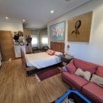Also via the pool terrace is another set of steps that lead up to the spacious, brightly lit, wooden conservatory with two glass sides and patio doors leading out onto a “balcony” currently used as a planted area, one side of the conservatory is a covered Bar-b-que area with an external chimney. The conservatory area has a carbon-fibre transparent ceiling and benefits from retractable sun blinds for extra shade during the summer. From the conservatory area the main front door leads into a very large sitting/dining room, which has two double patio doors leading through to the conservatory, both with electronically controlled persianas/sun blinds, allowing fabulous sea views. The whole villa benefits from a high-quality laminated, wood effect flooring and many recessed ceiling lights. At the far end of the main room is an area currently used as a study beyond leading to a double bedroom with a window and a large fitted wardrobe.
