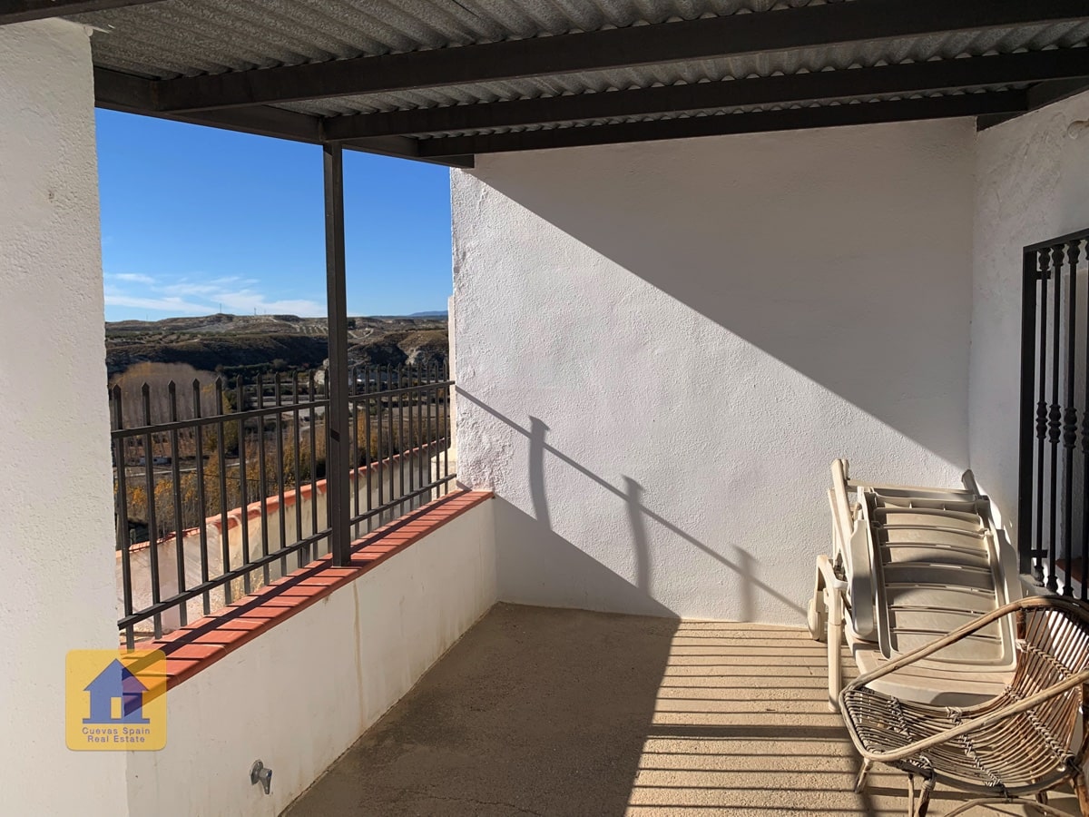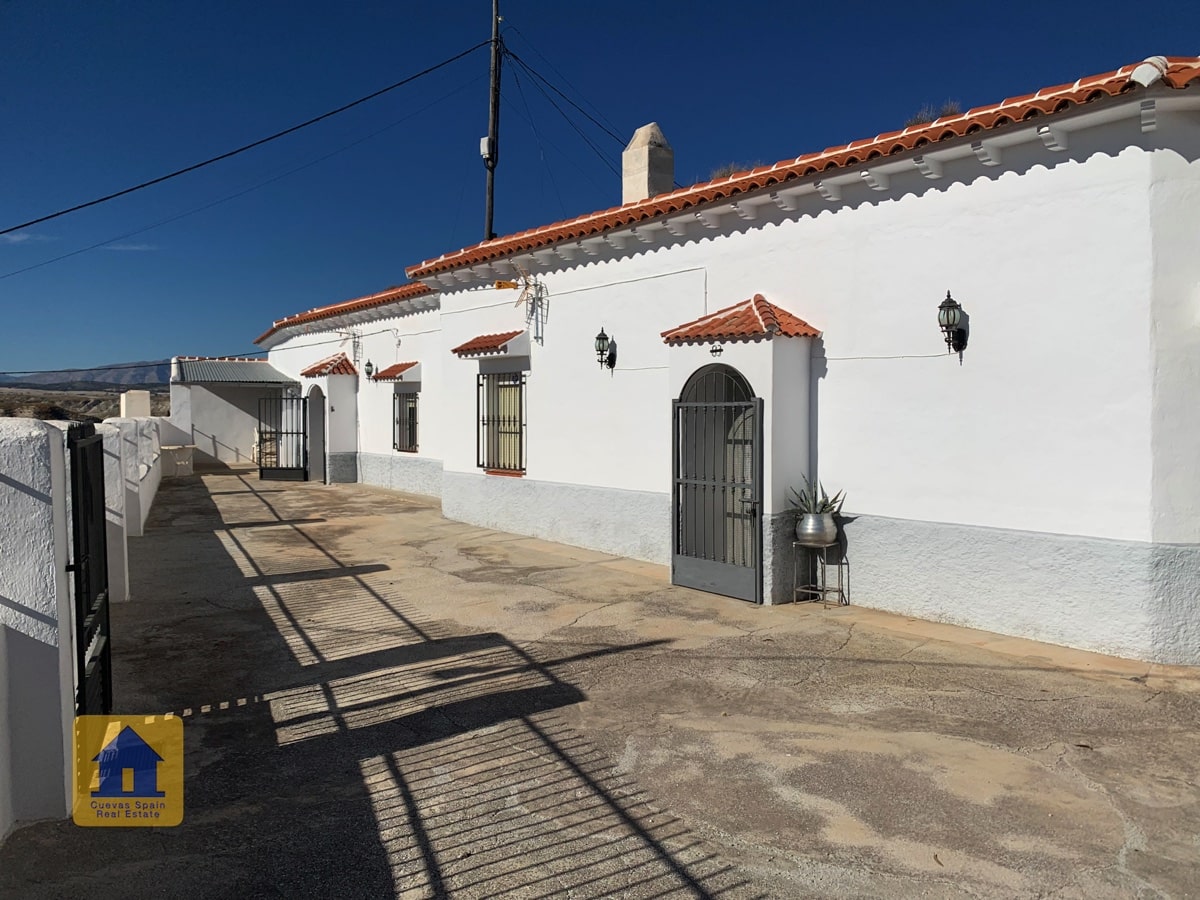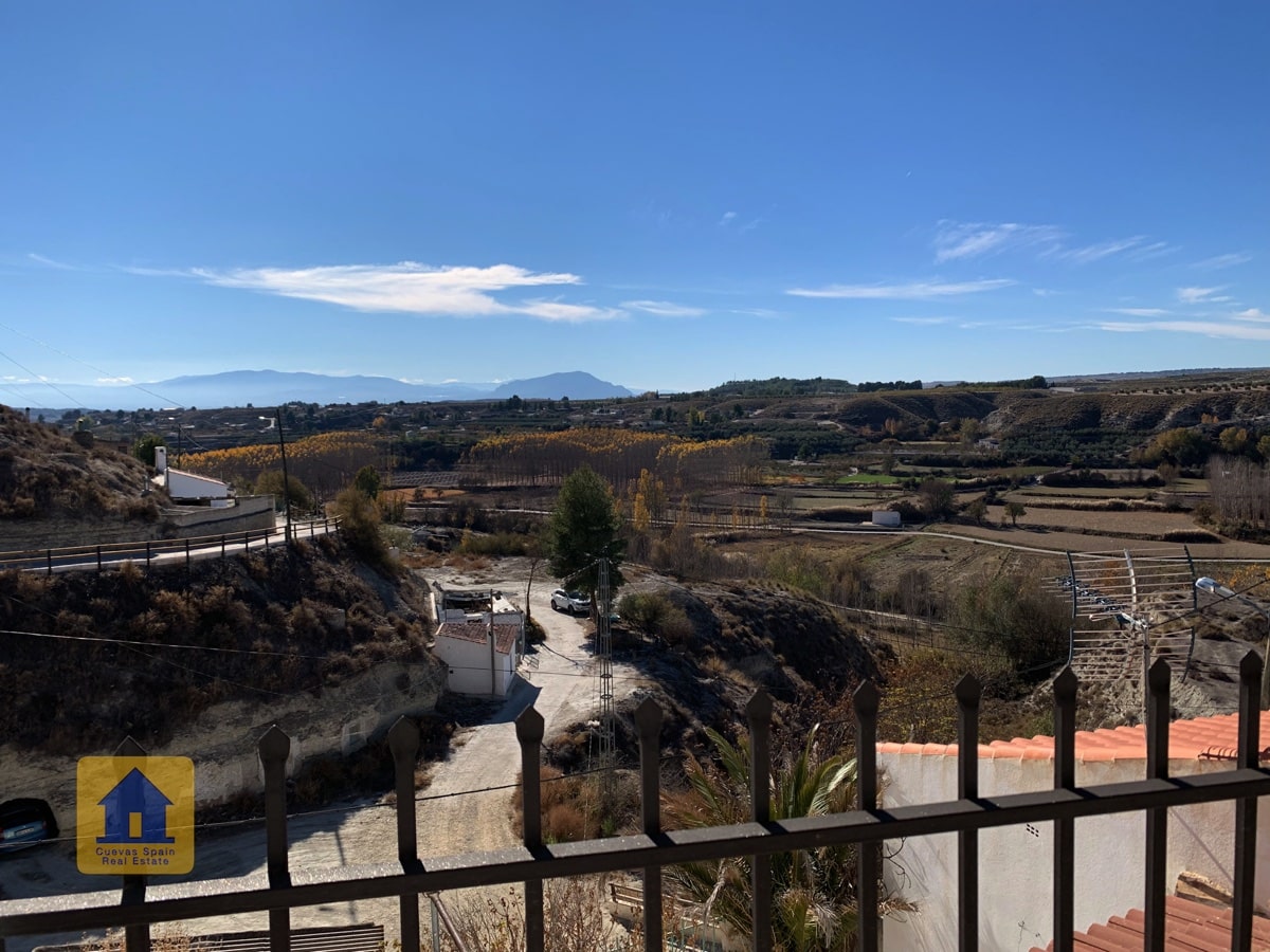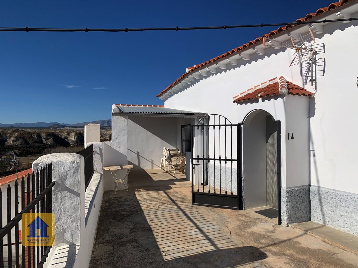 Fantastic cave house with stunning views of the badlands across the valley! The cave is very large and can be separated into 2 units, each with its own entrance, kitchen and bathroom. A private driveway leads to the gate and onto an expansive terrace with wide open views and a cozy covered sitting area at the far end. To the right upon entering the patio is the garage with a door leading into the house (The garage is currently used for wood storage.) There is a pantry/bodega and a laundry room. The property also has an underground room used for storing wood, and another cave with 2 rooms that was used for animals in the past and now has wood storage, accessible from the main road. There is ample space to park several cars on the property.