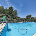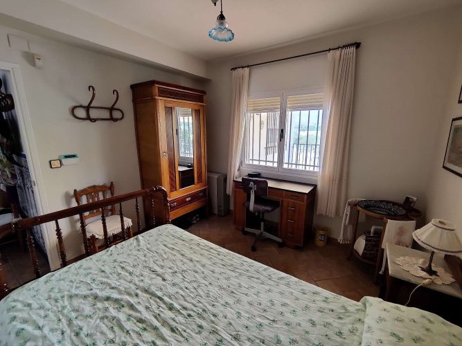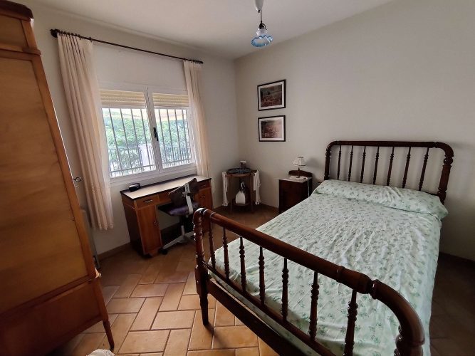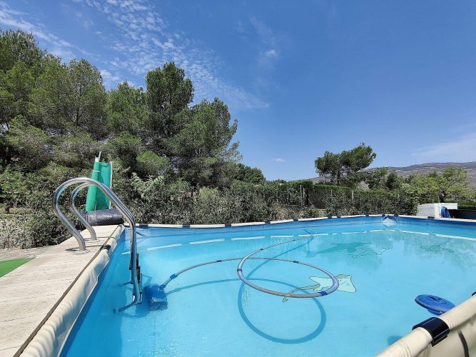 Outside there is a front porch and also a terrace coming out from the kitchen, a car port for 2-3 cars, and a barbecue with a toilet. There is an above ground pool at the back of the house. It has mains water, electricity and a shared septic tank with the neighbors, as they both used to be the same family. A private septic tank could easily be installed if wanted. Quiet residential area not far from town, with great views of the countryside and good road access.