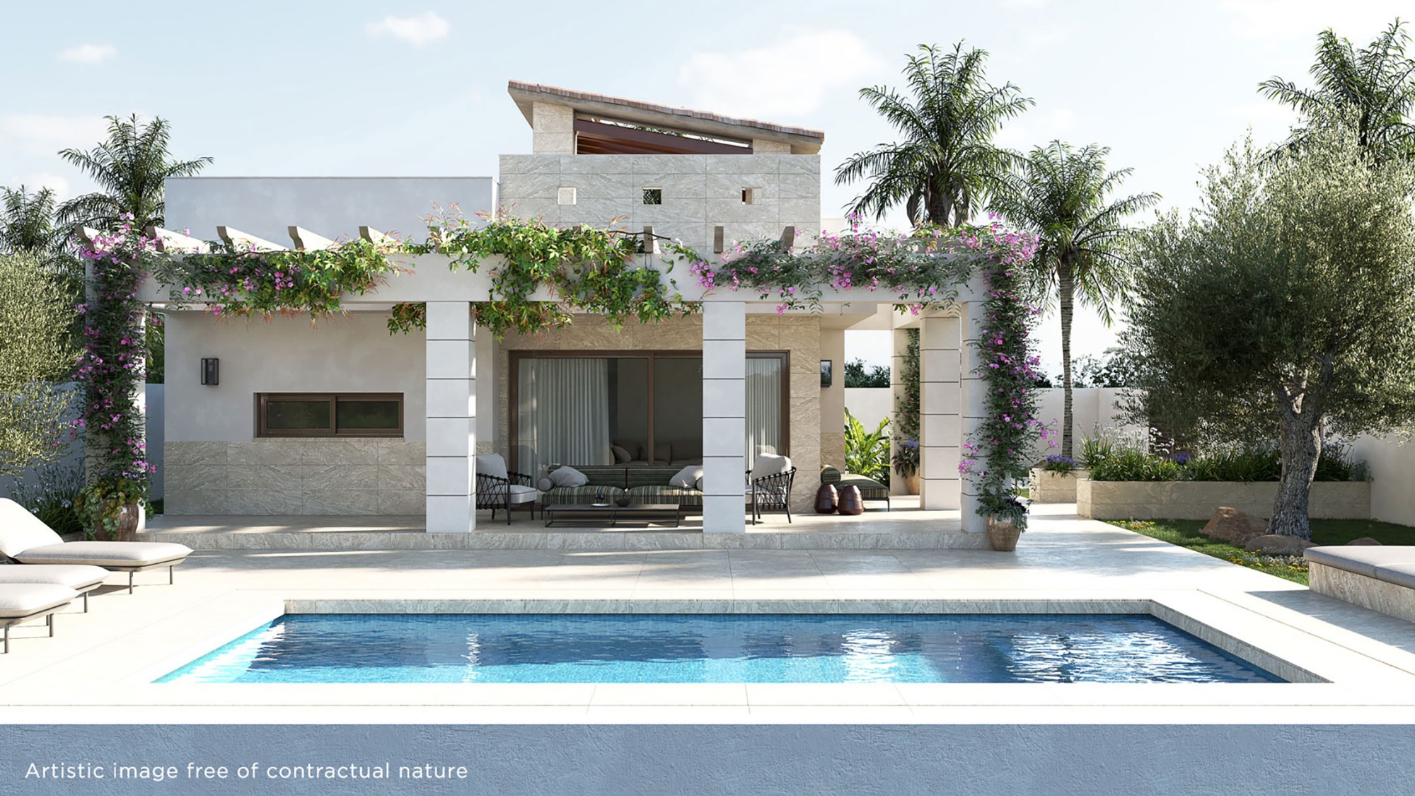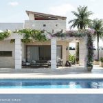 Contemporary design homes with 3 bedrooms and 2 bathrooms, built on plots of 480-720m2. The design of these homes combines elegant surfaces with natural materials such as stone and wood, which is reflected in the interior spaces. The main living area is open plan, integrating the kitchen, dining room and lounge which lead out onto the spacious, partially covered terrace. The outdoor areas, such as the terrace, the garden, the private pool, as well as the solarium are ideal places to enjoy the Mediterranean lifestyle. These homes have top quality finishes, including pre-installation of hot/cold air conditioning through ducts, built-in wardrobes, electric shutters, private pool, storage room and parking area within the plot.