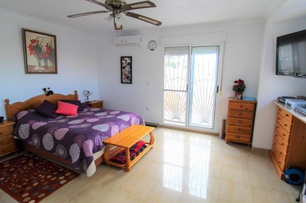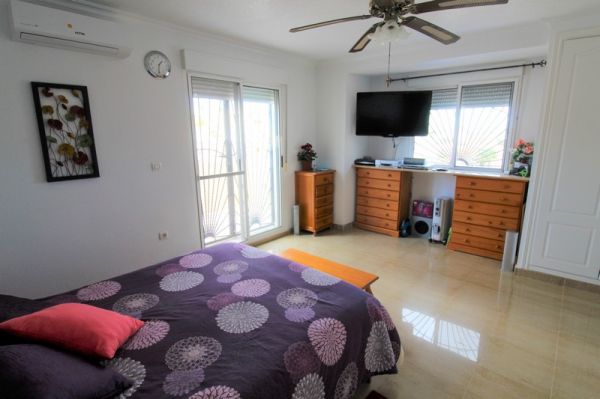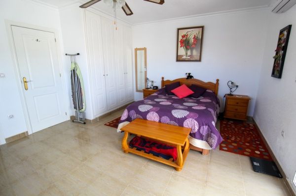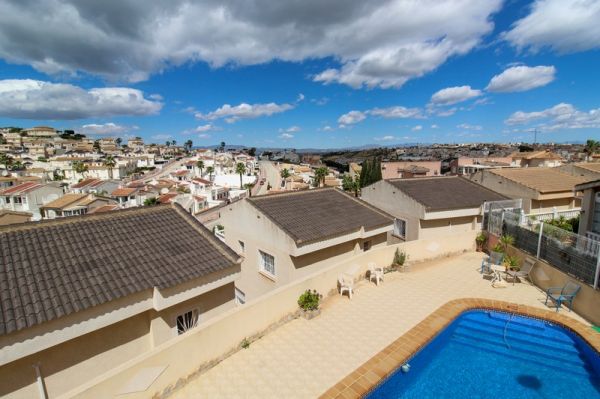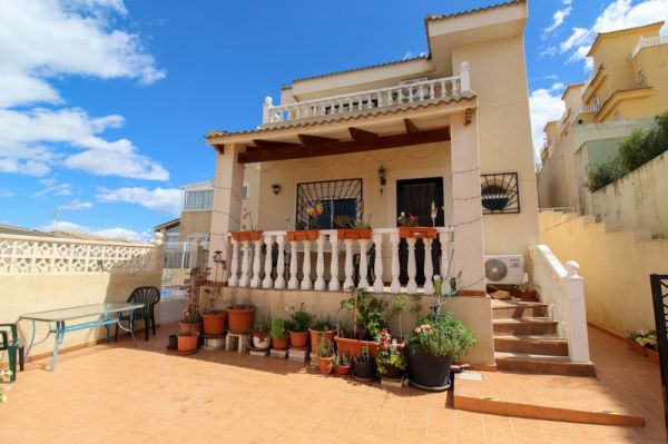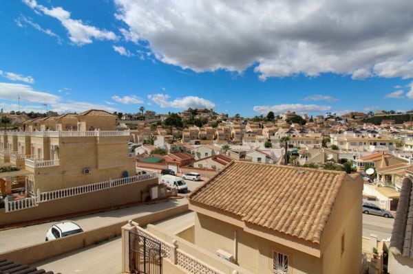 This spacious 3 bedroom detached villa is located close to the La Marquesa Golf Course in Ciudad Quesada in a small community of only 10 villas.The villa has a practical layout with a large lounge and dining area, separate kitchen, cloakroom toilet and a double bedroom all on the ground floor. Upstairs you have a further double bedroom, a family bathroom with bathtub and a shower cubicle and a huge master bedroom with en-suite shower room. From the master bedroom is a generous terrace with great views over the surrounding area.Outside, the plot has all been tiled for low maintenance and has an off-road parking space, a covered terrace at the front of the house and a separate store room / workshop at the rear.Although the outside space is fairly limited, the communal pool is adjacent to the property and has plenty of room around it for sunbathing.Within a short drive you have the golf course and a multitude of bars, restaurants and shops whilst the beaches of Guardamar are just a 10 minute drive away.The villa is large enough for a family and is extremely well presented but it may not be suitable for everyone due to the hilly surroundings.Interest in this villa will be strong, so contact us to book your viewing today.