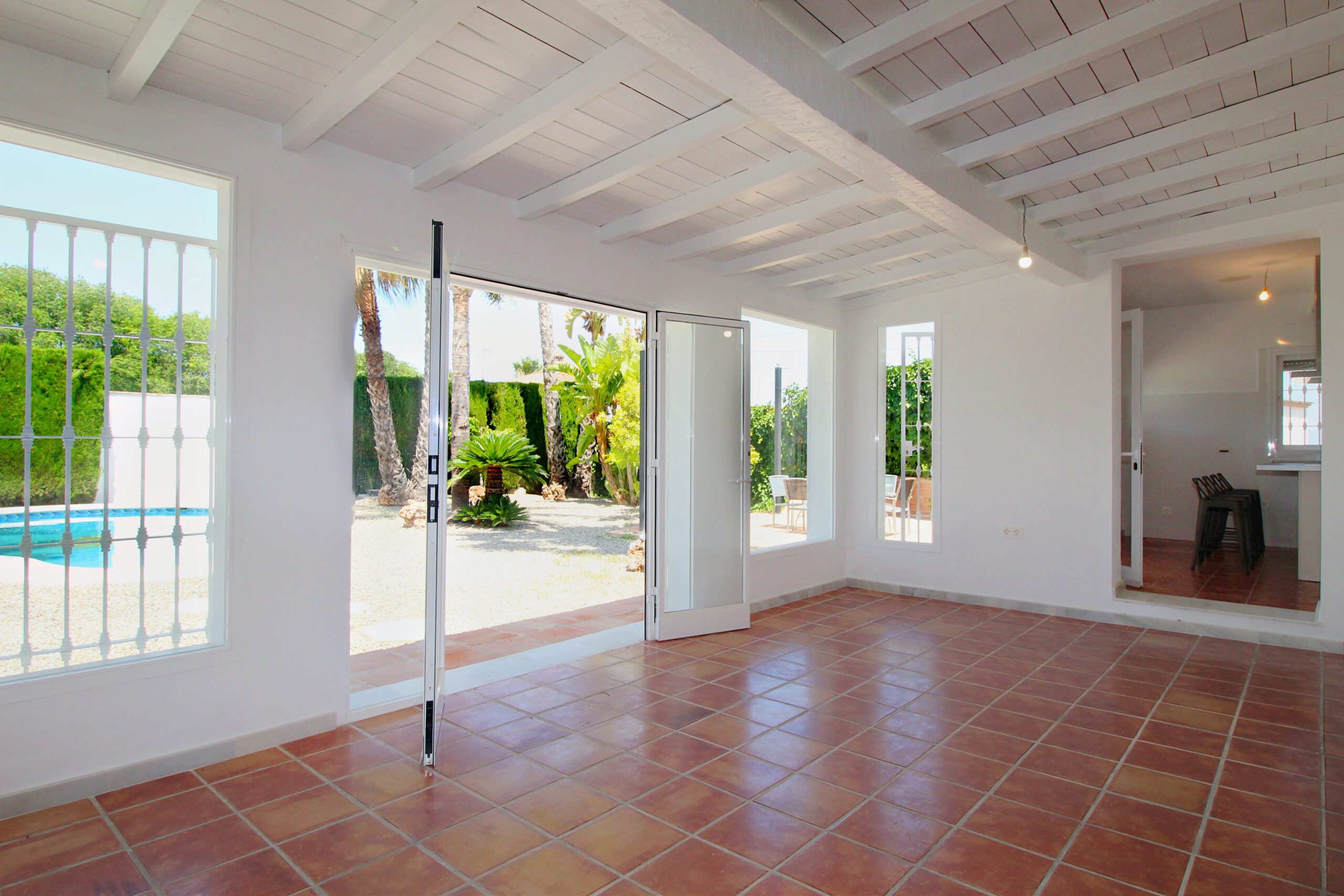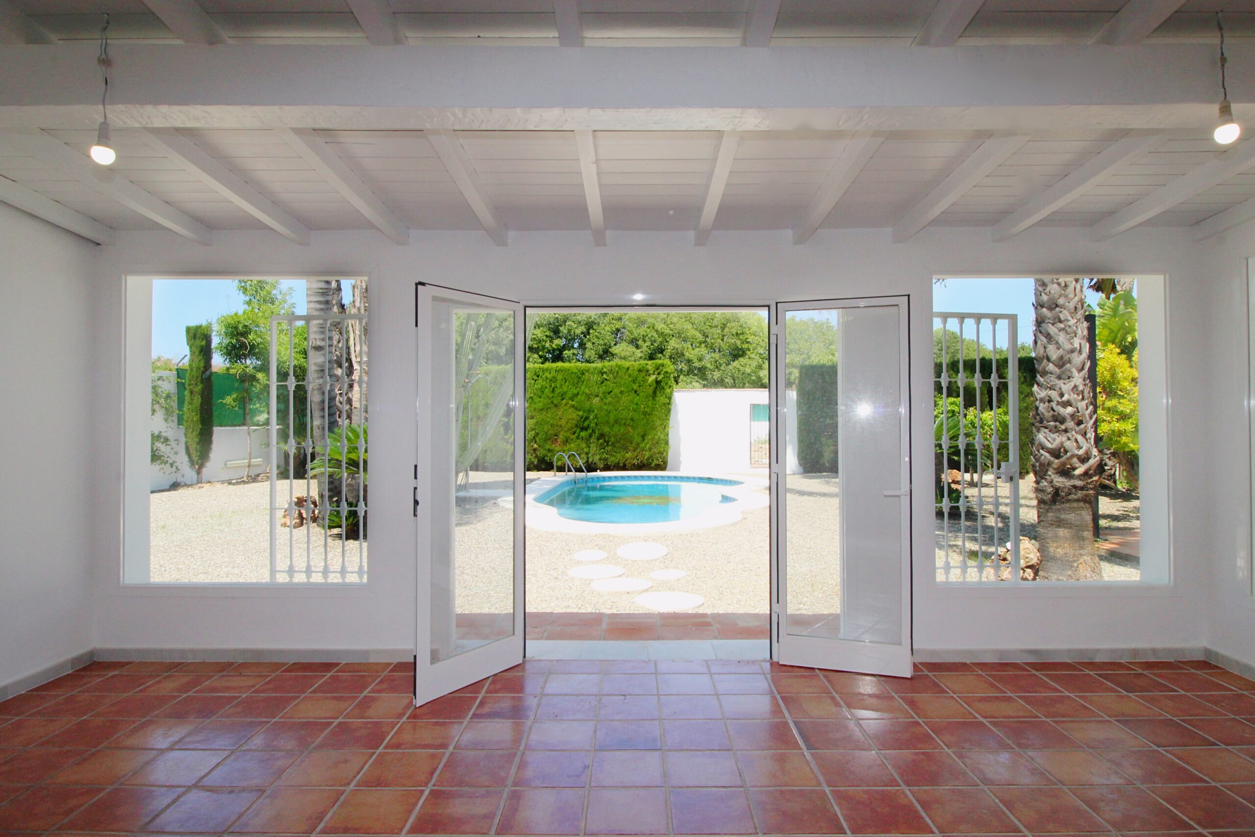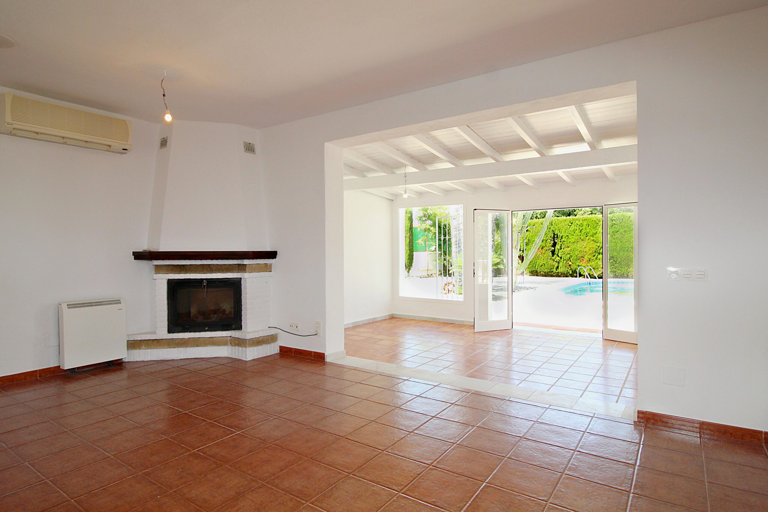Entering the house you arrive at the open plan hallway leading to the completely new kitchen and large lounge with enclosed terrace giving the space a bright feel with access from the kitchen and lounge. The lounge has a wood burning fire for the cooler evenings and large doors leading to the pool and gardens
