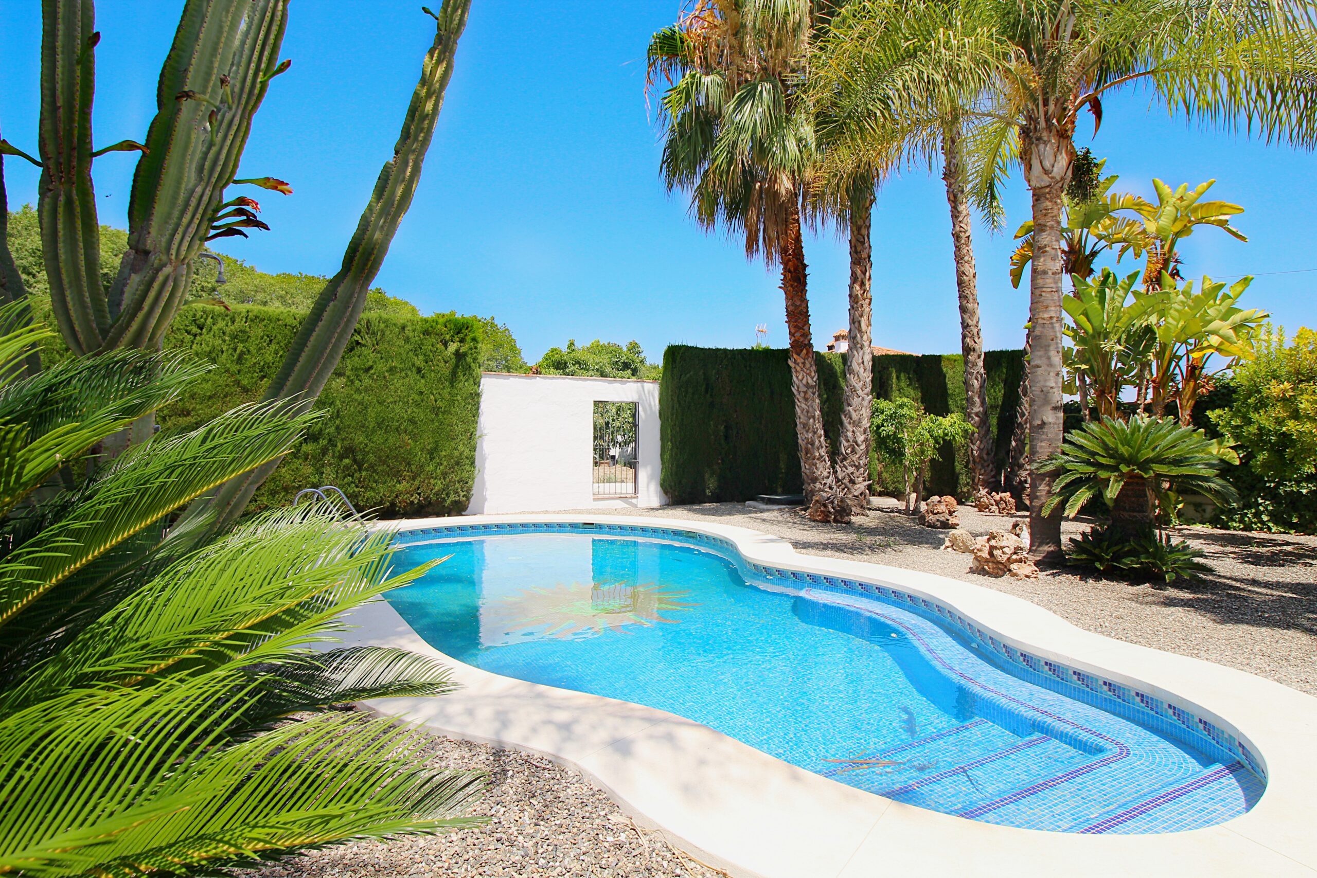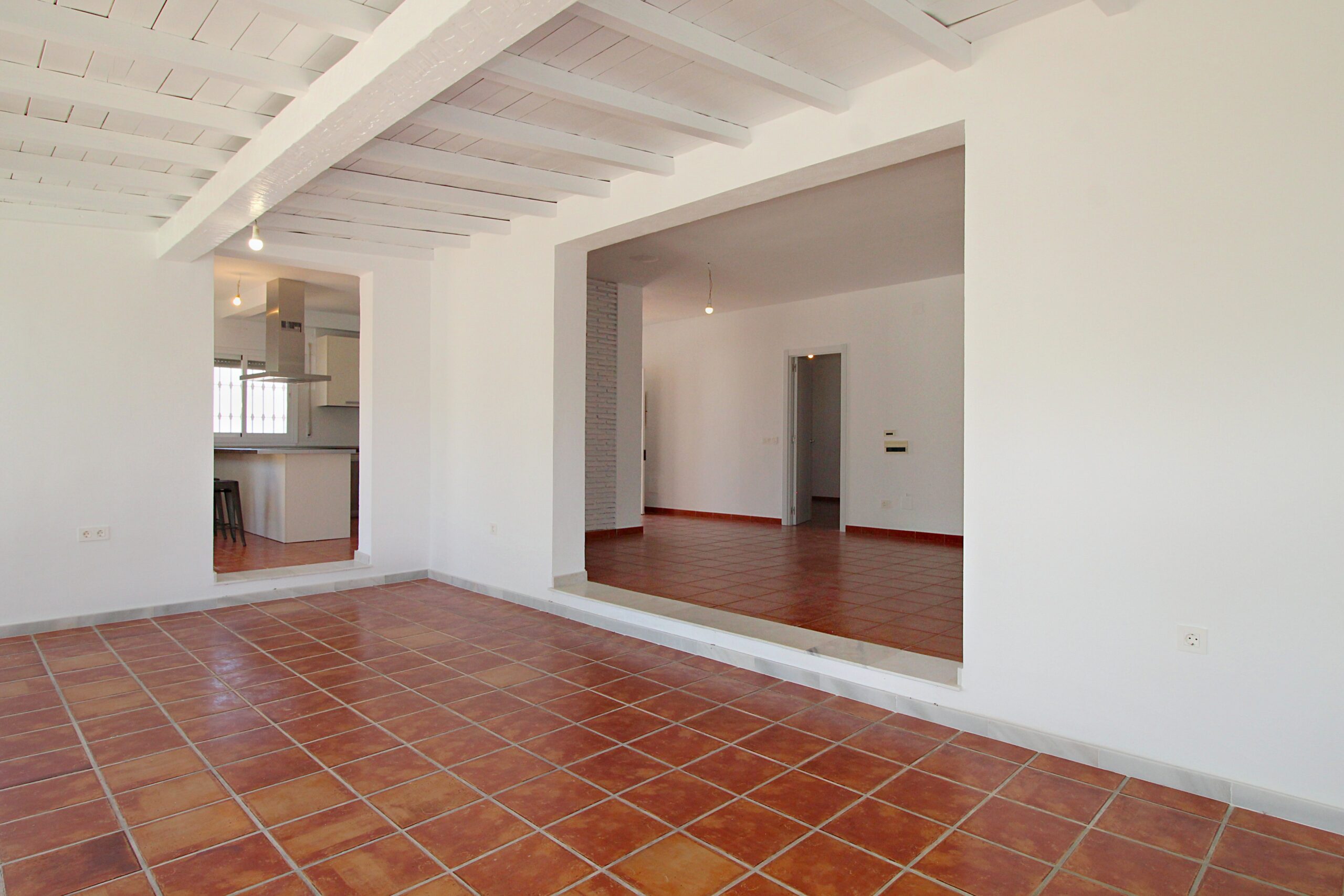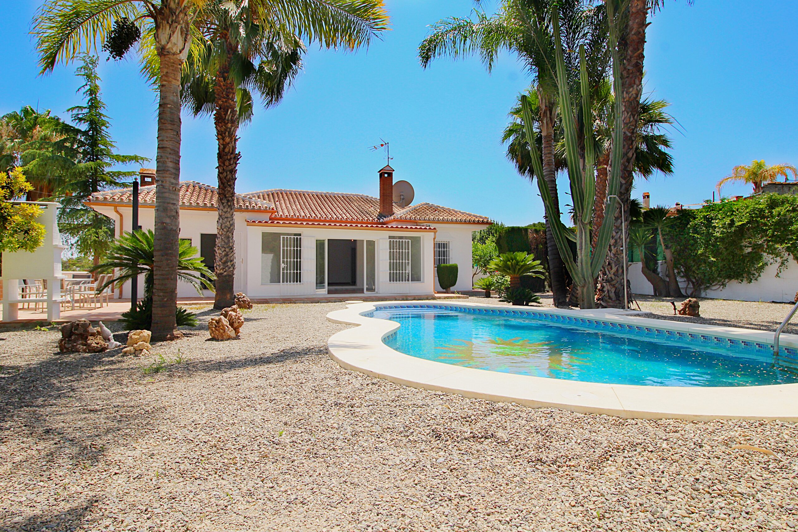 Entering the house you arrive at the open plan hallway leading to the completely new kitchen and large lounge with enclosed terrace giving the space a bright feel with access from the kitchen and lounge. The lounge has a wood burning fire for the cooler evenings and large doors leading to the pool and gardens