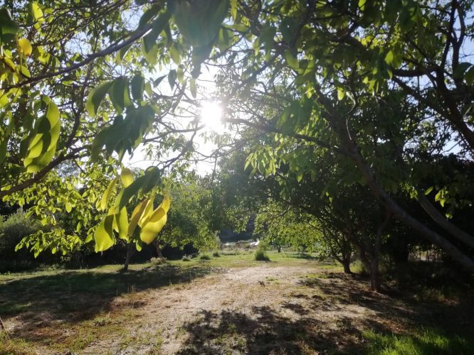 Riverside Farmhouse that sits within a beautiful piece of flat land has not had any artificial fertilizers used on it in more than 30 years . The fertile land combined with the already prepared areas for cultivation and the greenhouses would be perfect for creating organic vegetable and herb gardens . There are many different types of fruit trees and even walnut trees within the orchard area of the Finca.