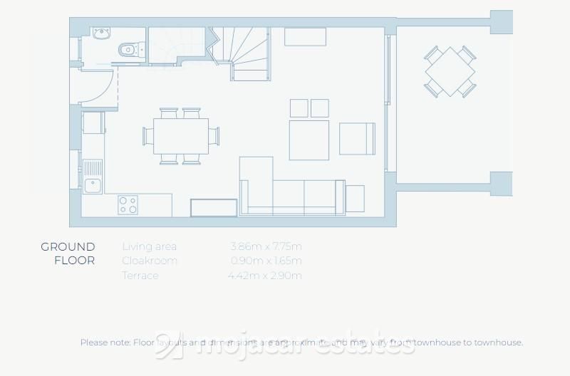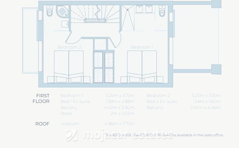 Each townhouse offers approximately 100m² of built area, arranged over two floors, with a private roof terrace (solarium) ranging from 19m² to 33m², depending on the individual property.