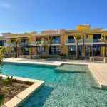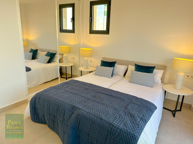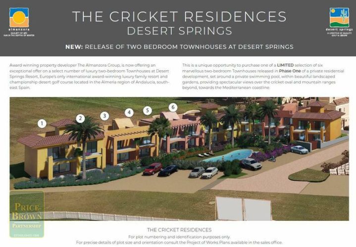 A private residential development with fourteen marvellous two-bedroom Townhouses set around a private swimming pool, within beautiful landscaped gardens, occupying an envious position on the resort of Desert Springs.Contemporary design and natural light are the outstanding characteristics with an interior that offers a stylish home with modern appeal, providing spectacular views over the cricket oval and mountain ranges beyond, towards the Mediterranean coastline.Living rooms lead out to a covered veranda. Each property has the use of a parking area, gardens, swimming pool and a private roof solarium. High quality finishing’s include; an attractively tiled bathroom and shower room. An open plan kitchen with ‘Silestone’ worktops, with the fridge/freezer and washing machine integrated within the cupboards. A Ceramic hob, cooker hood & microwave. Air conditioning, double glazing, mirrored wardrobes to bedrooms with high quality ‘Roca’ or ‘Porcelnosa’ sanitary ware and fittings throughout.