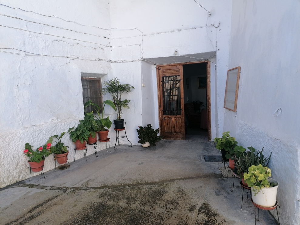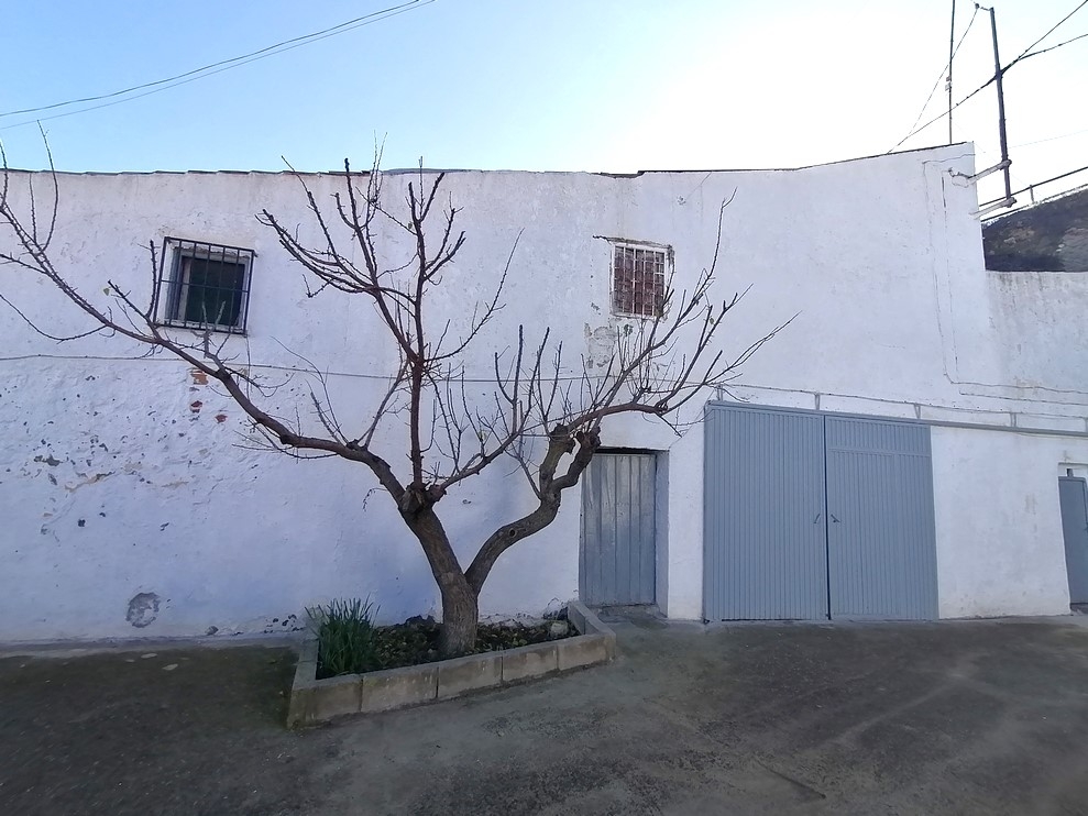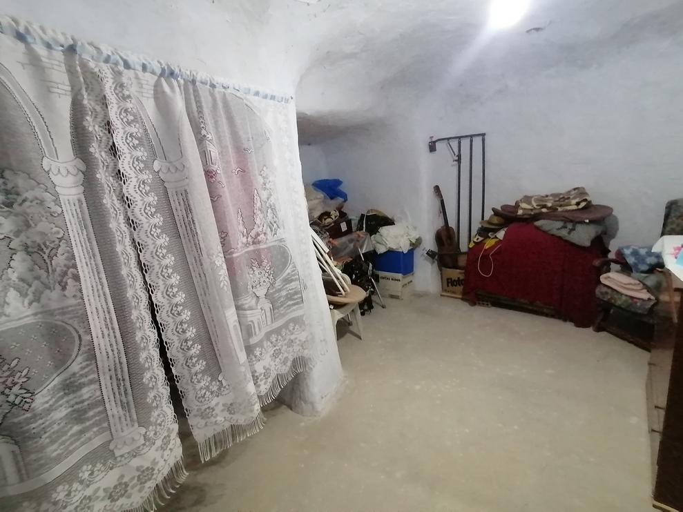 For sale: A very spacious and habitable cave house with space for 4+ bedrooms, a large patio, and a two-storey garage and storage building in Cuevas del Campo, Granada, just a few minutes' walk from the village centre. Easy, level access with plenty of parking space and a small garden to one side. The cave is in good condition with a very practical room layout. It has mains electricity and water connected, and good internet is available.