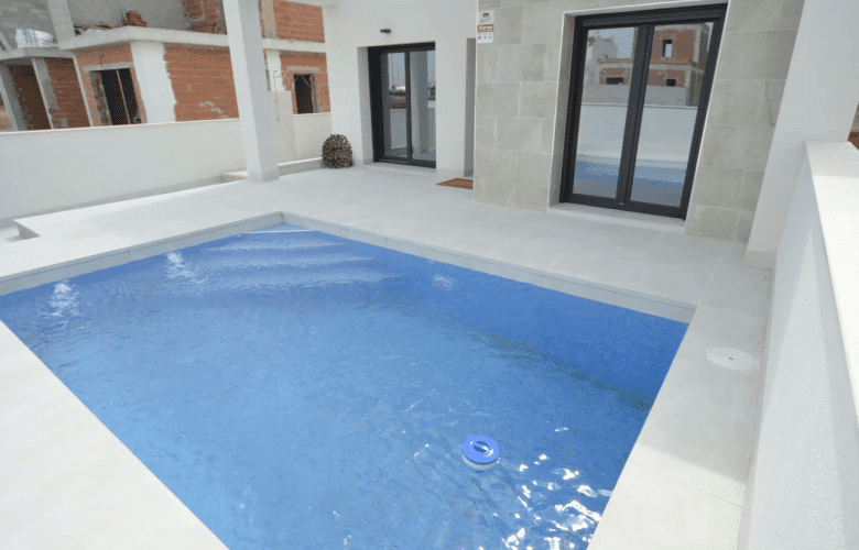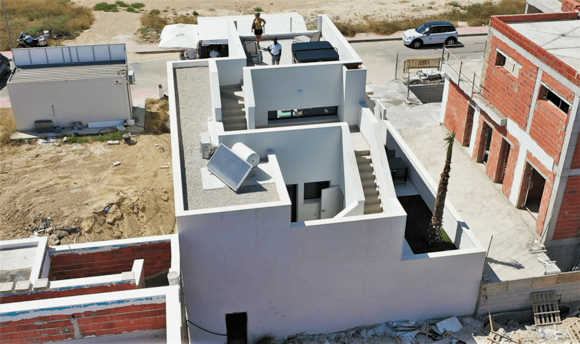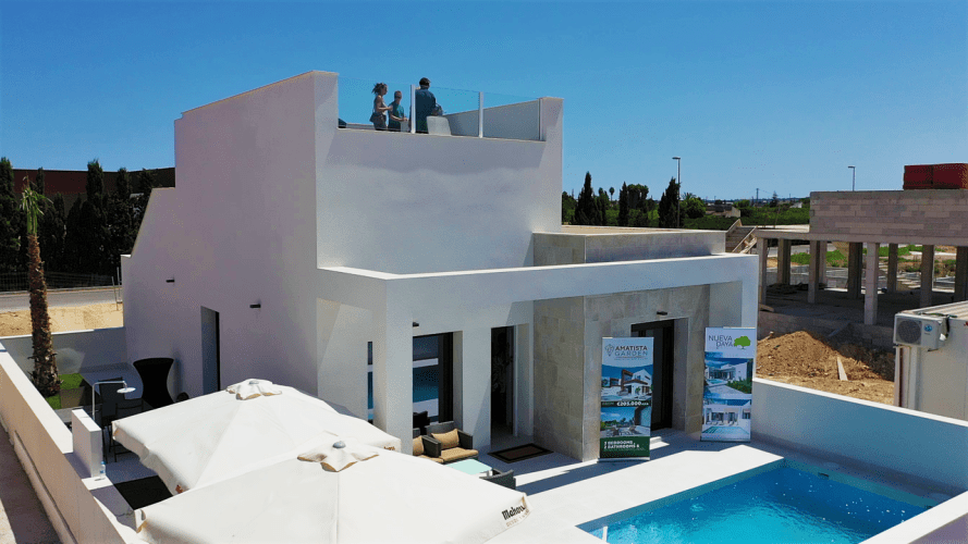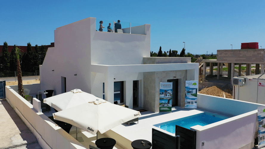 The properties are new build bungalows, all on one floor in the new part of this village; a short walk to the centre of the town. They offer 2 bedrooms, 2 bathrooms, solarium and private splash pool. Dining/living room with open plan kitchen, heaps of natural light, generous patio and stairs to stunning solarium. Both bedrooms have fitted wardrobes and the master suite features an en suite bathroom with opening doors onto the terrace and swimming pool.