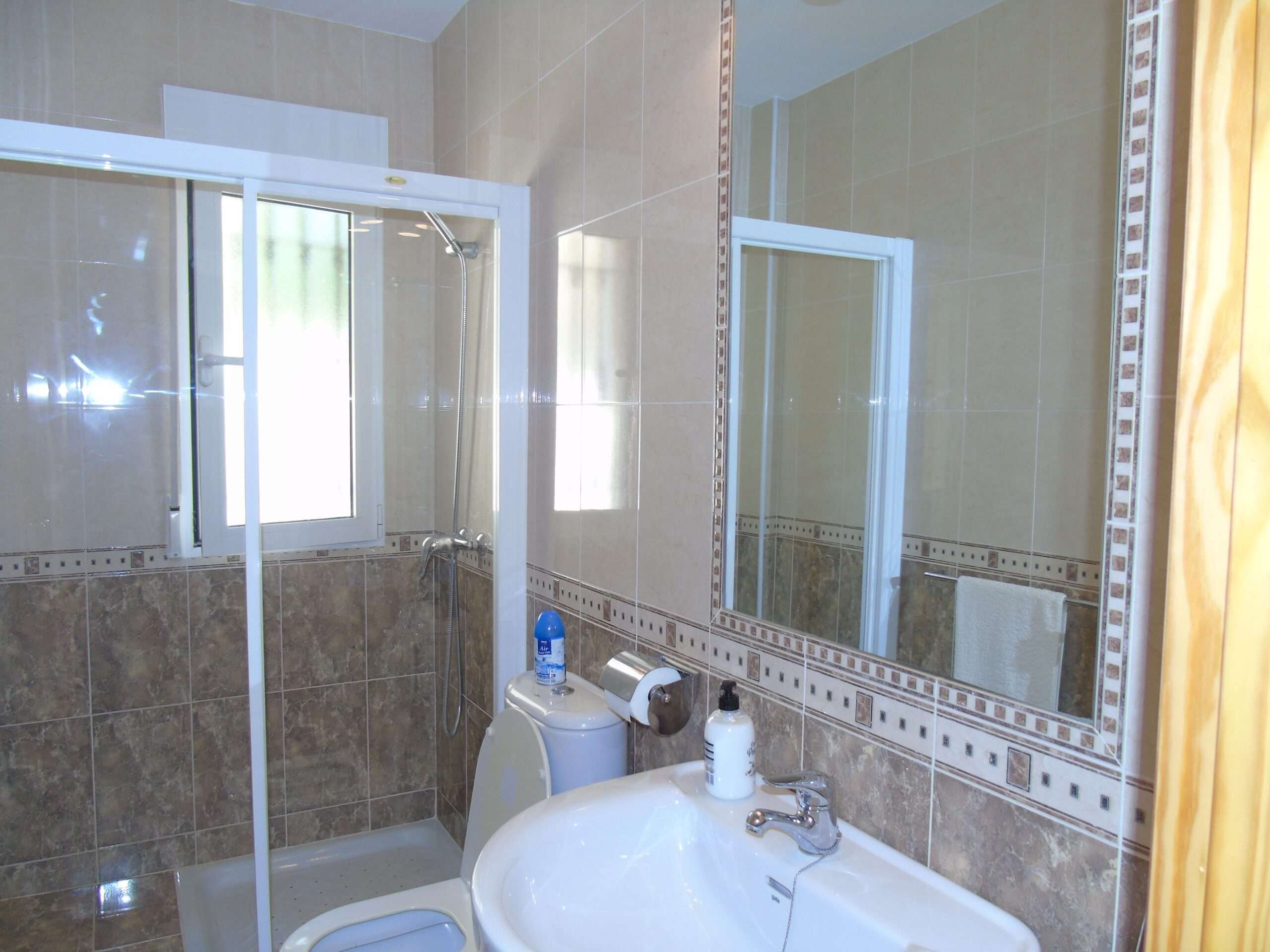 Bathroom 1 - 3m2: Walk in with shower with a fitted screen. WC, hand basin and a mirror.