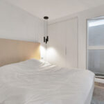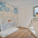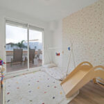 The upper level is dedicated to the master bedroom, complete with an en-suite bathroom and walk-in wardrobe. From here, you have access to an additional private terrace, which leads up to the roof solarium—offering generous space and sea views, ideal for enjoying summer days and evenings.