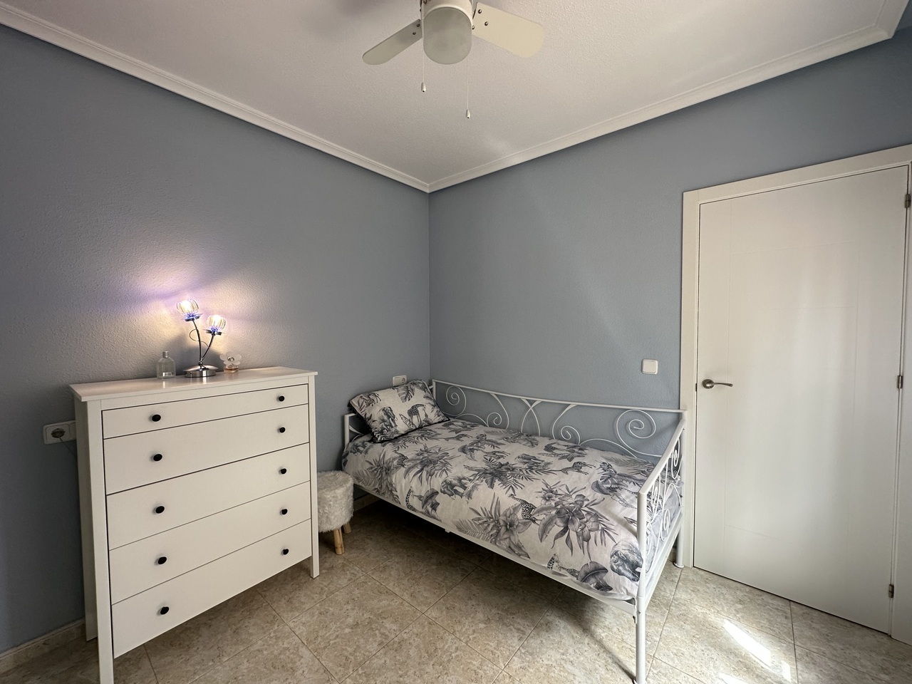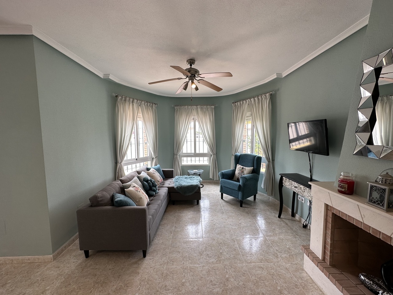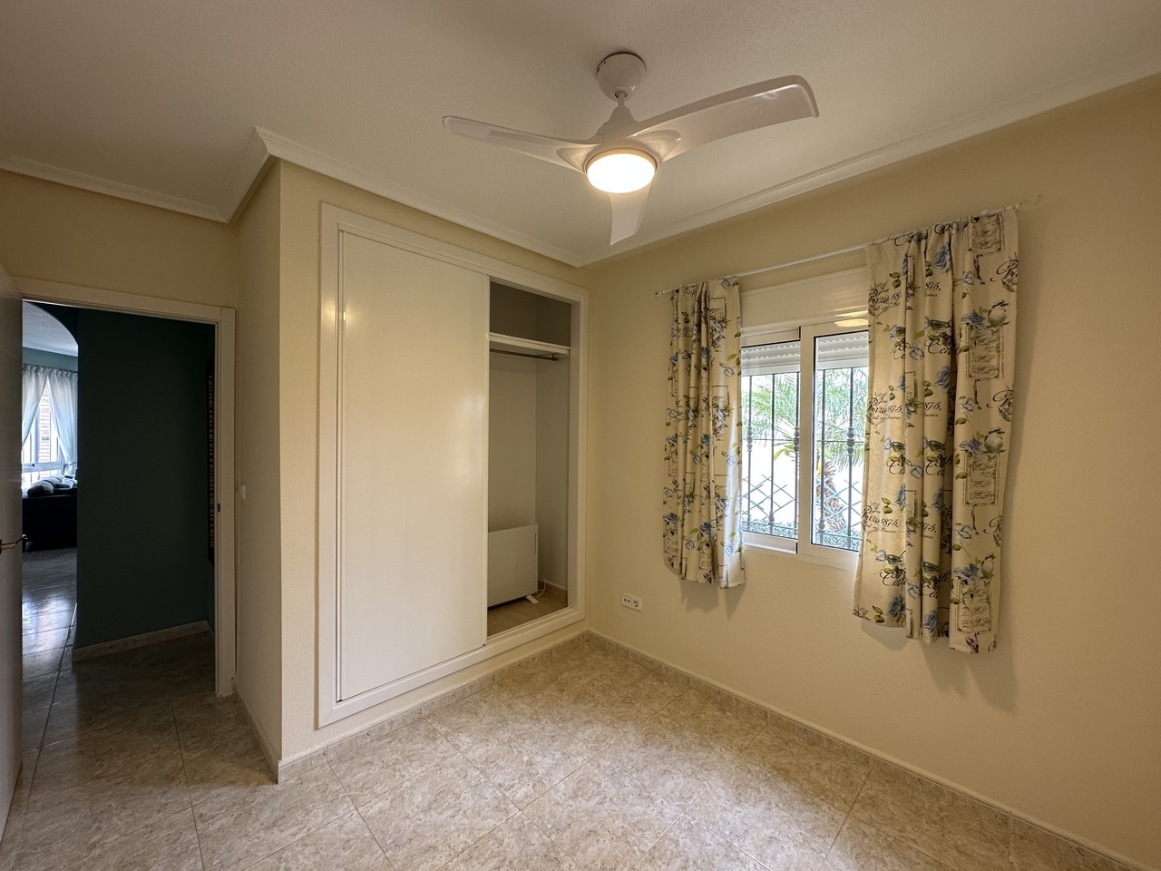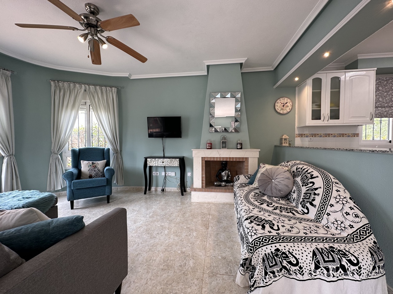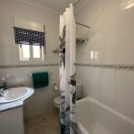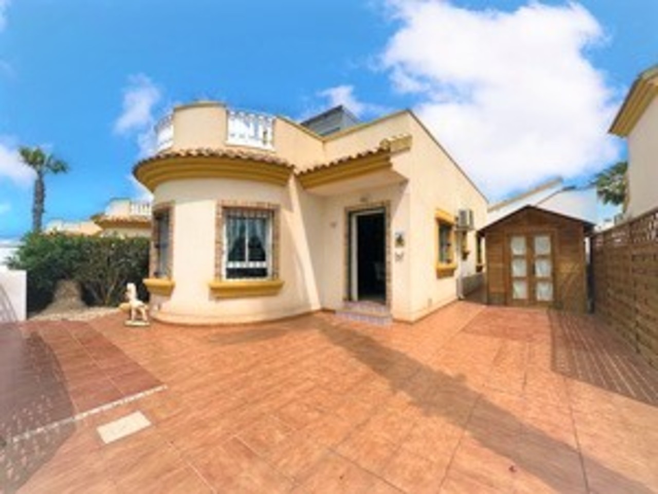 Immaculate and well presented detached villa for sale in El Raso, Guardamar del Segura. This villa forms part of a small community and is situated on a well-appointment south east plot opposite the communal swimming pool. The spacious villa has all of the living space on one level but also boasts a private solarium with attractive views towards the lakes and over the pool area. Inside the stylish property is a huge living and dining room with feature brick-built fireplace. There is a slick and fully equipped kitchen with plenty of workspace and cupboards. The hallway leads to the family bathroom and two large bedrooms, one which is now the utility but could be easily changed back to an en-suite bathroom. The property sits on 200m2 plot with driveway and attractive shed, currently used for storage. To the rear of the villa is a staircase leading upstairs to the spectacular solarium. The property is sold furnished as seen with many extras including purpose built storage areas and air-conditioning.
