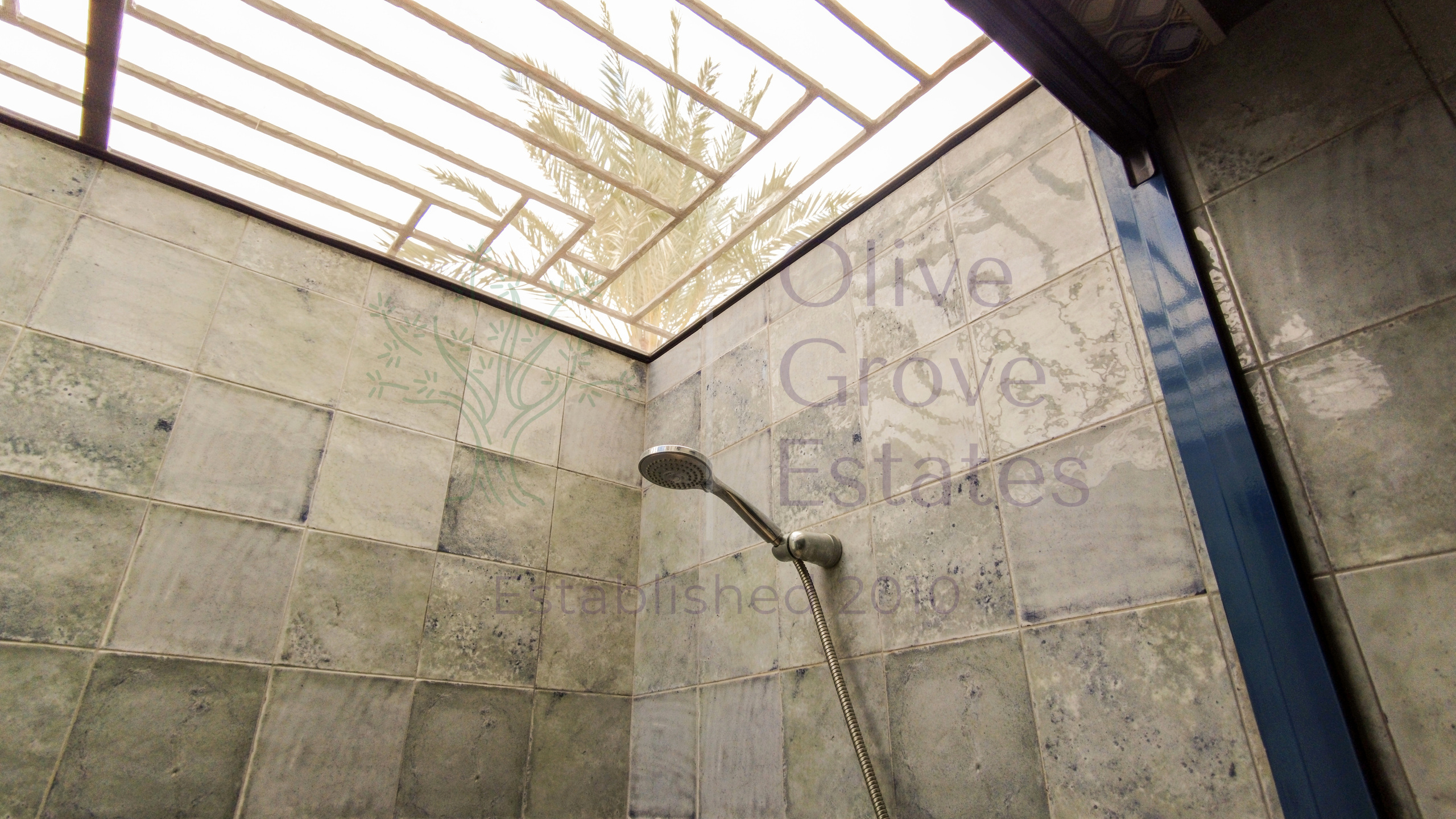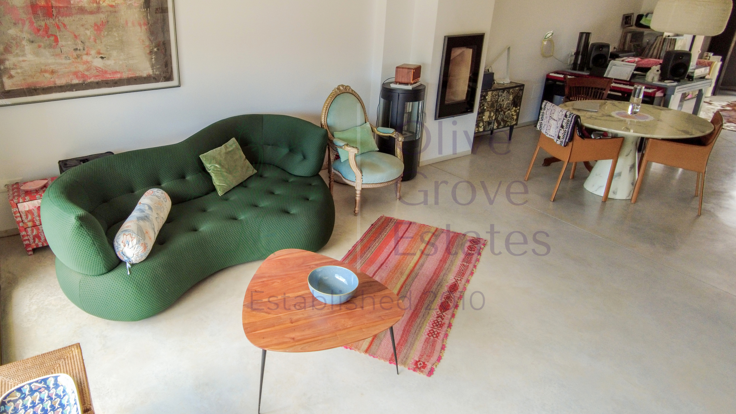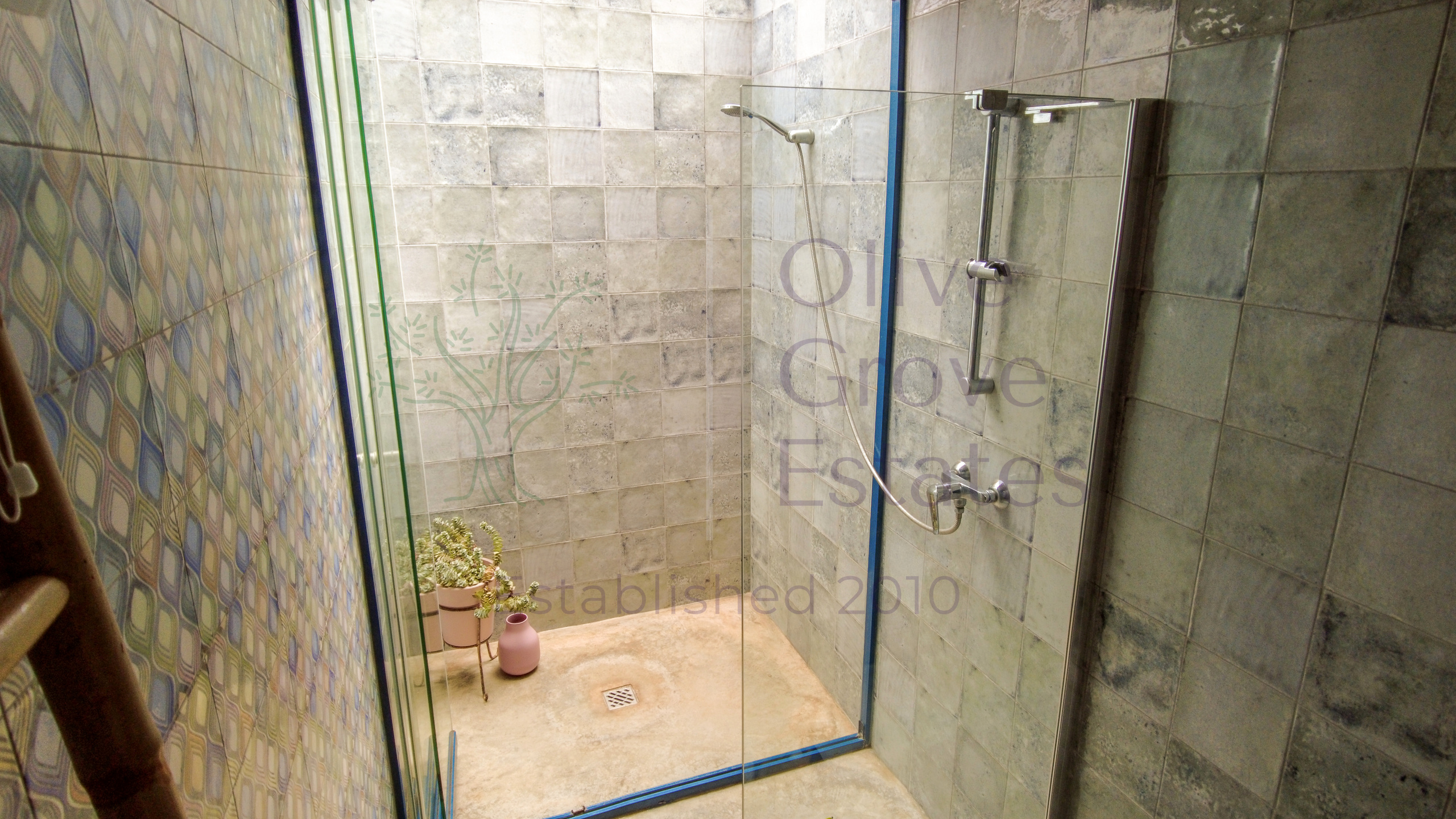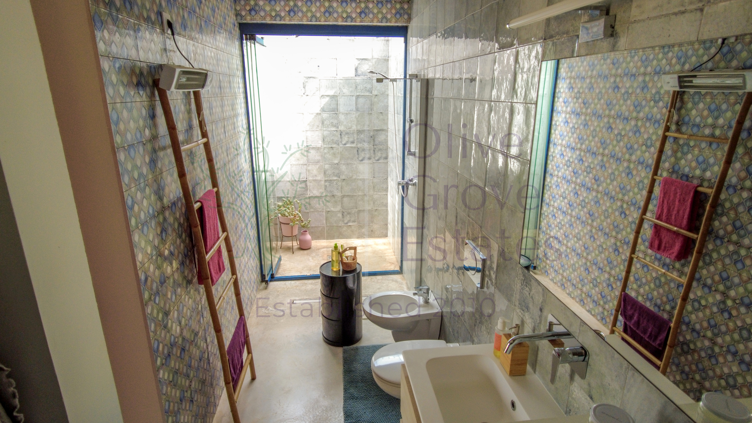 The home offers numerous extras to ensure maximum comfort and functionality. A bright kitchen comes fully equipped, while PVC interior carpentry with double glazing full glass doors that enhances both insulation, style and gives you a wonderful indoor-outdoor place to cook. With features like microcement flooring, underfloor heating, central air conditioning, and a heat and cold pump, this property is designed for year-round enjoyment. High ceilings and an armored door add both charm and security, while solar panels, rainwater collection tanks, and a biological purifier highlight the home’s eco-friendly approach.