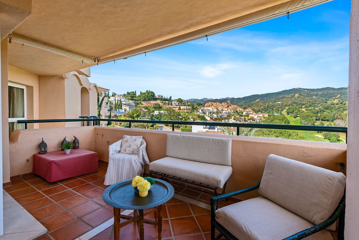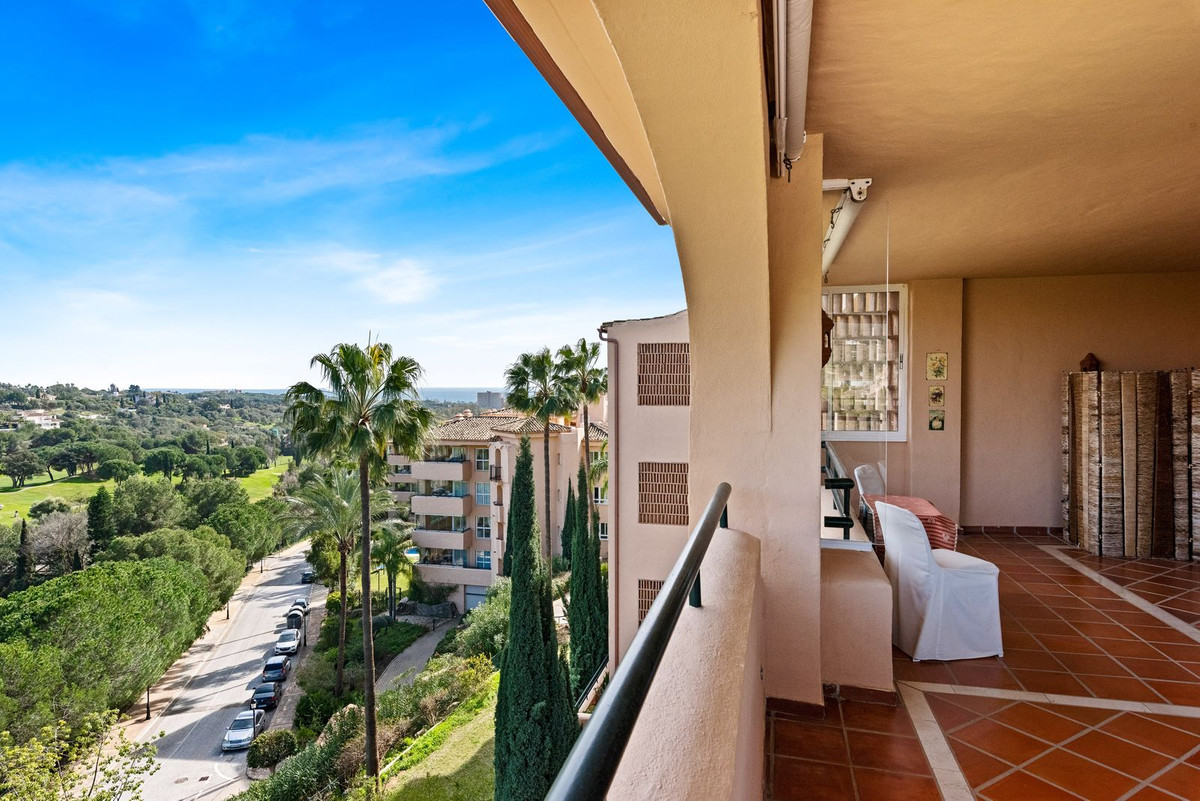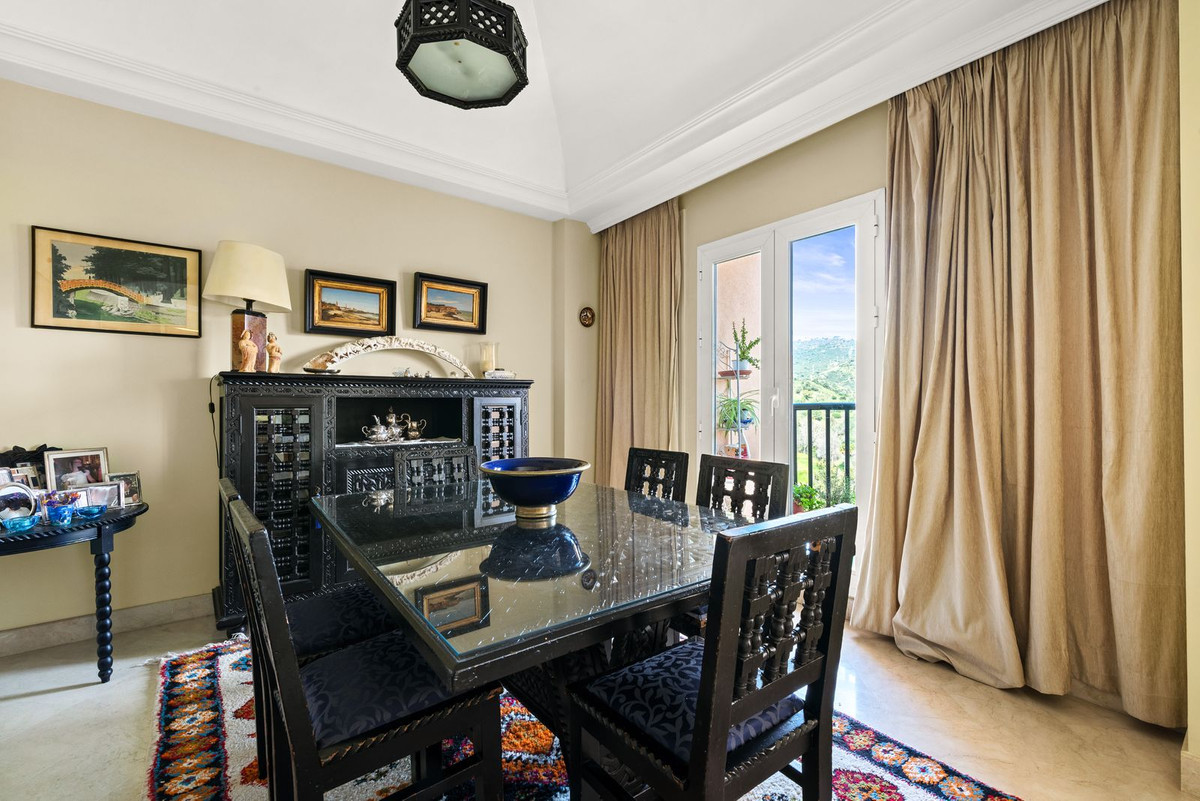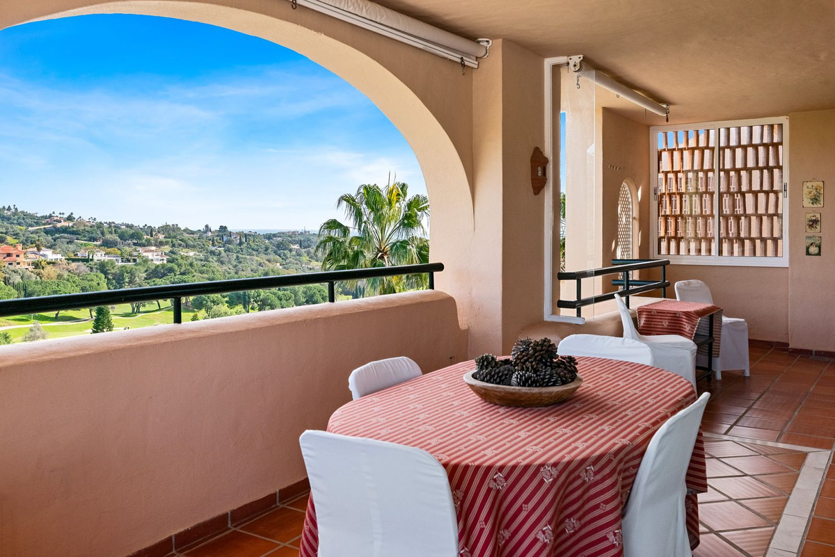 The apartment comprises a large entrance hall with fitted wardrobes, a bright living room with fireplace and a generously sized dining area, all with direct access to a large 40 sqm terrace offering a 240º panoramic view over the golf course, the sea and the mountains.