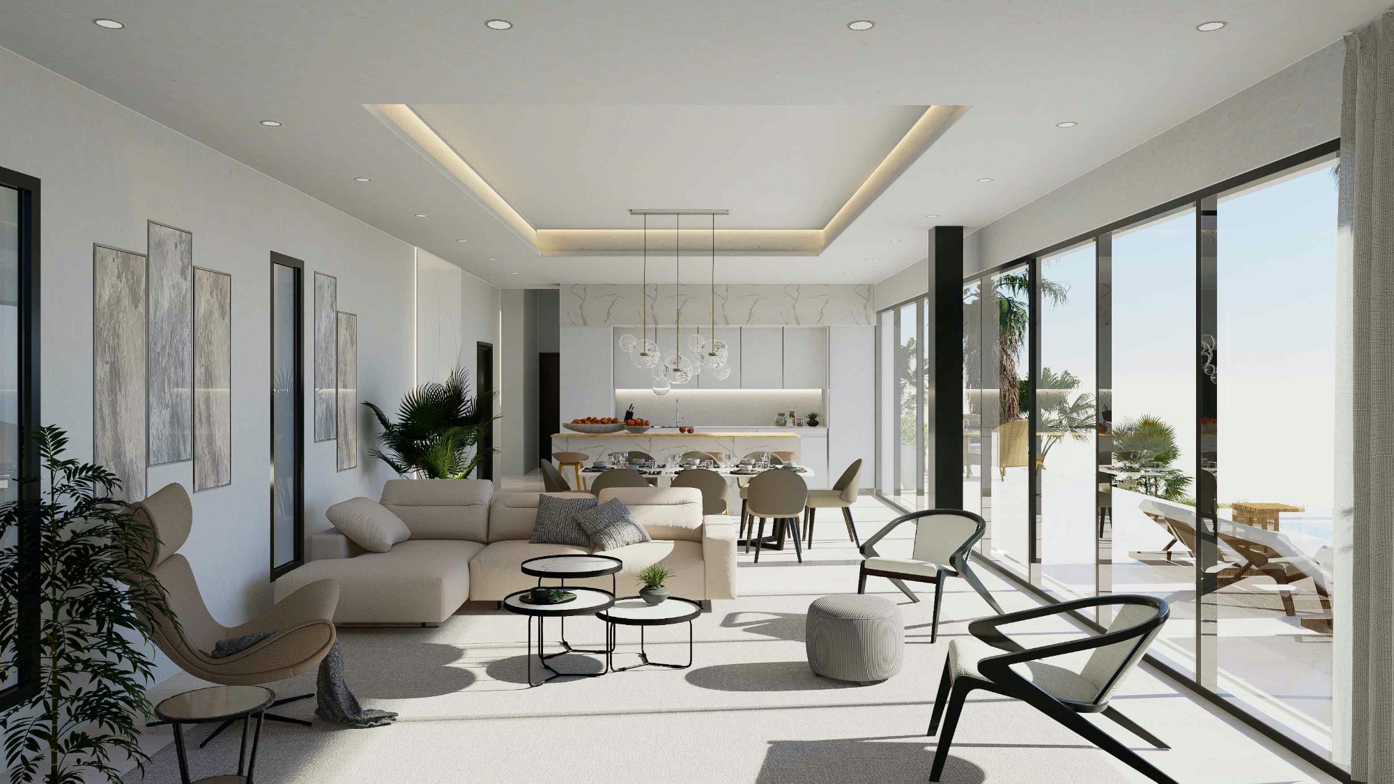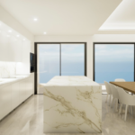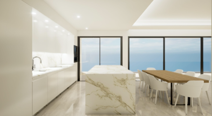 INTERIOR FLOORS Porcelain stoneware floors in 90x90 cm format for interior floors, or natural marble or large format porcelain stoneware floors chosen from the options offered. EXTERIOR FLOOR Accessible exterior floors in 90 x 90 format in non-slip natural marble or porcelain material, selected from the options offered. SIDING Natural stone, concrete bricks or continuous reinforced concrete covering, to choose from the options offered.