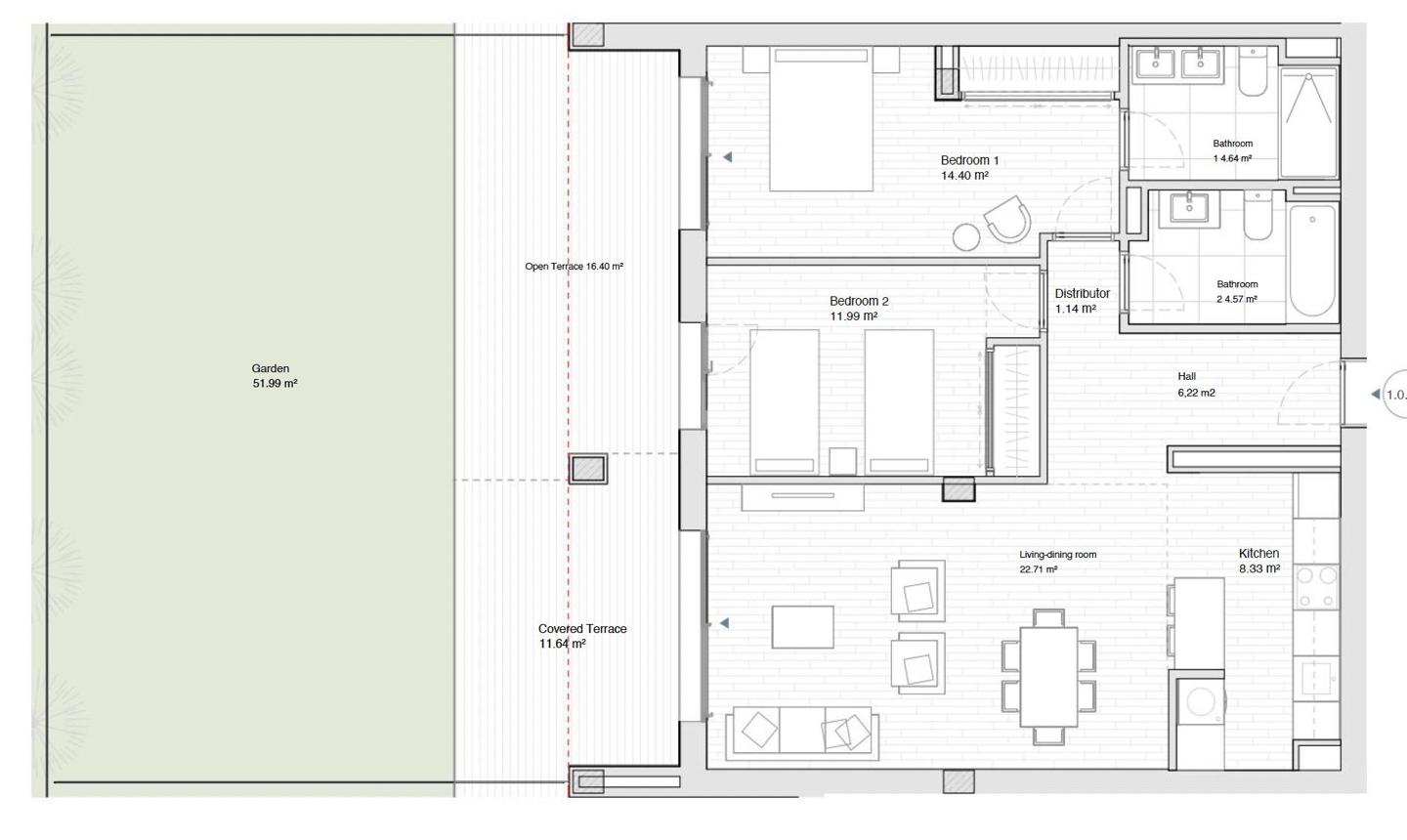 The apartment offers a well-designed contemporary layout with a bright open-plan living and dining area connected to the outdoor spaces. In addition to a generous 29m² of terraces, ideal for outdoor dining and relaxing, the property also benefits from a private 52m² garden, giving it the feel of a small house and making it particularly attractive for buyers looking for ground floor living with usable exterior space.