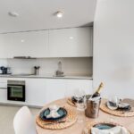 The apartment offers an open-plan living and dining area with a fully fitted modern kitchen equipped with Bosch appliances. The bedroom is en-suite and enjoys direct access to the spacious private terrace, creating a seamless indoor-outdoor living feel ideal for both everyday living and holidays.