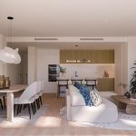 Inside the apartment, every detail has been meticulously designed to maximize natural light and comfort. The open-plan layout and sliding glass doors seamlessly connect the living room to the terrace, creating a bright and spacious atmosphere. The fully equipped kitchen, fitted with high-end appliances, is perfect for cooking enthusiasts. Additional features include built-in wardrobes in the entrance and a separate storage area for the washer and dryer, adding convenience and extra storage space. The bedrooms are generously sized, with the master suite featuring an elegant en-suite bathroom with a modern glass shower.