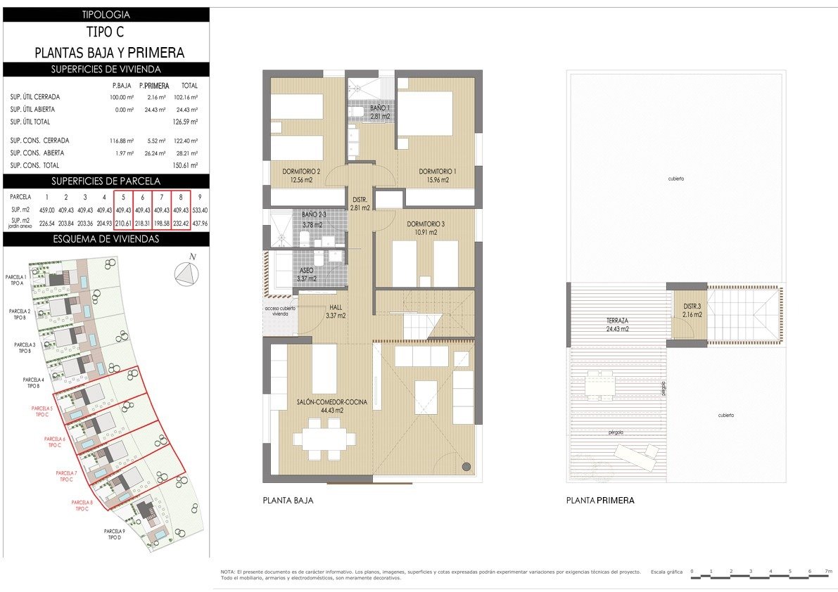 All villas has 3 bedrooms, 2 or 3 bathrooms, open plan kitchen with lounge, build-in wardrobes, air conditioning and aerothermal, equipped kitchen, private garden with pool and parking.